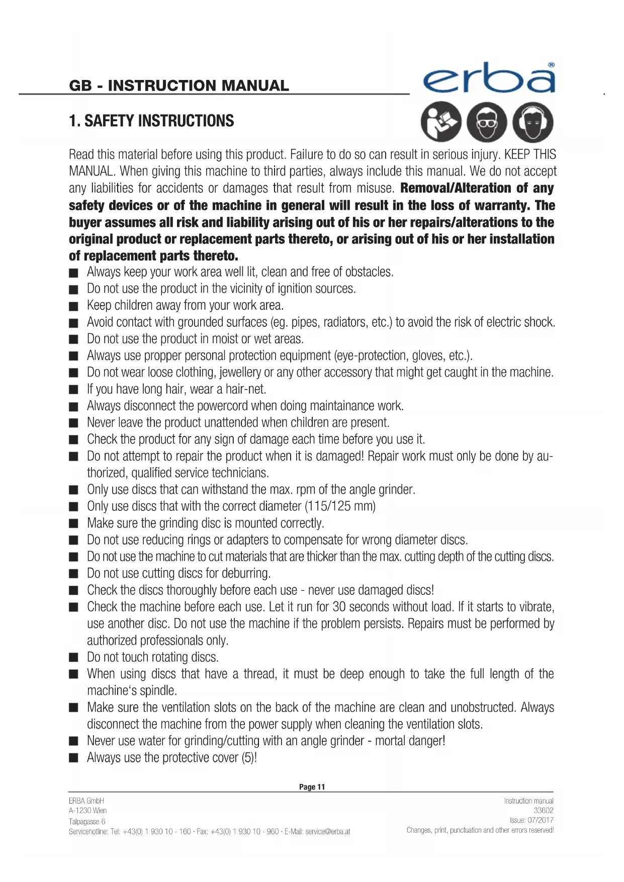 The angle grinder is designed for dry cutting and dry grinding of materials like stone or metal with suitable cutting/grinding discs. Any other use is prohibited. The buyer accepts all liabilities, legal and otherwise, for any damage or injury resulting from improper use of the product (i.e. any other use than the above stated designated use).