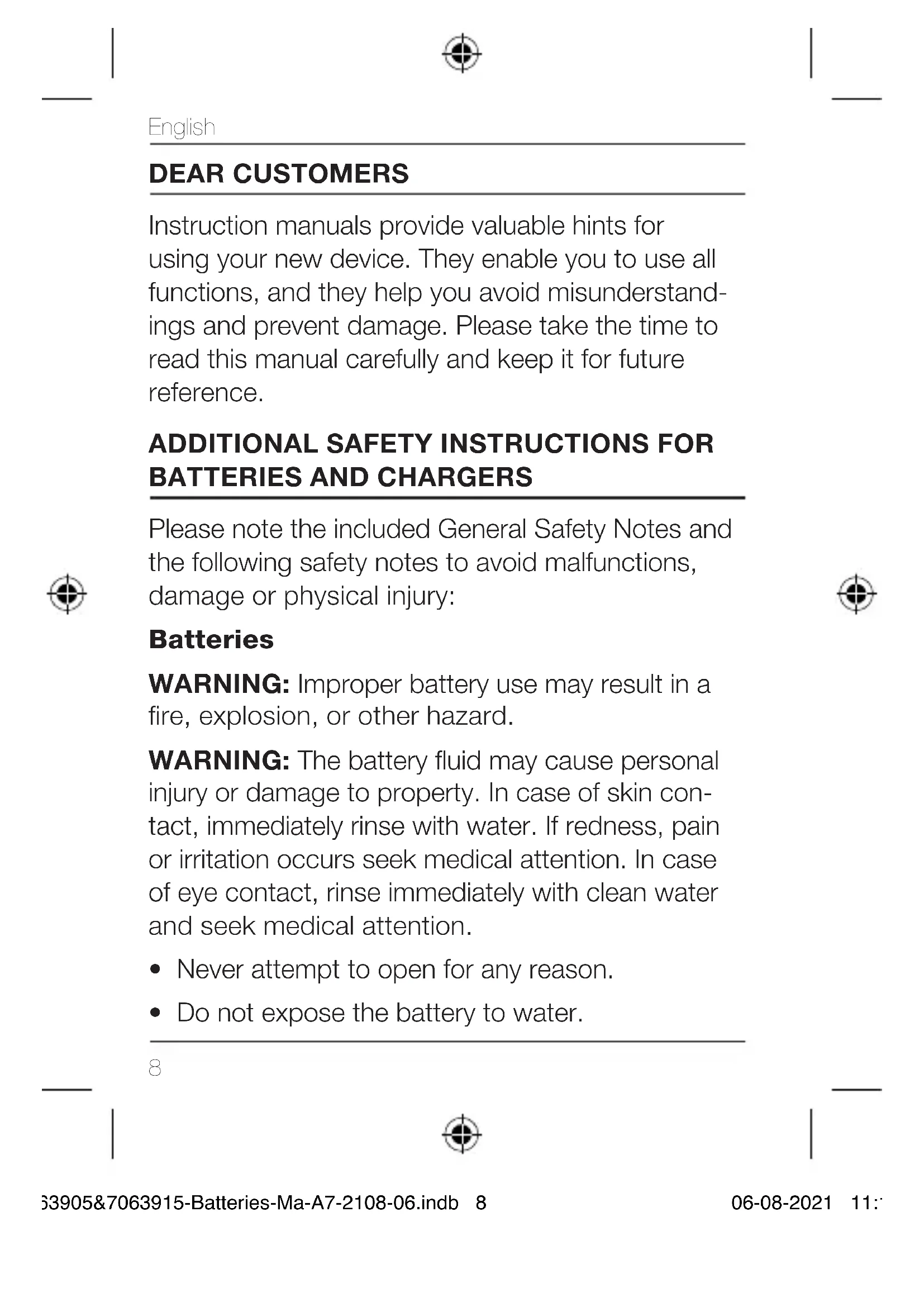 - Take special care of the battery. Avoid drop- ping it onto any hard surface and do not sub- ject it to pressure or any other form of mechanical stress. Keep the battery away from extreme heat and cold. 7063905&7063915-Batteries-Ma-A7-2108-06.indb 97063905&7063915-Batteries-Ma-A7-2108-06.indb 9 06-08-2021 11:1806-08-2021 11:18English
