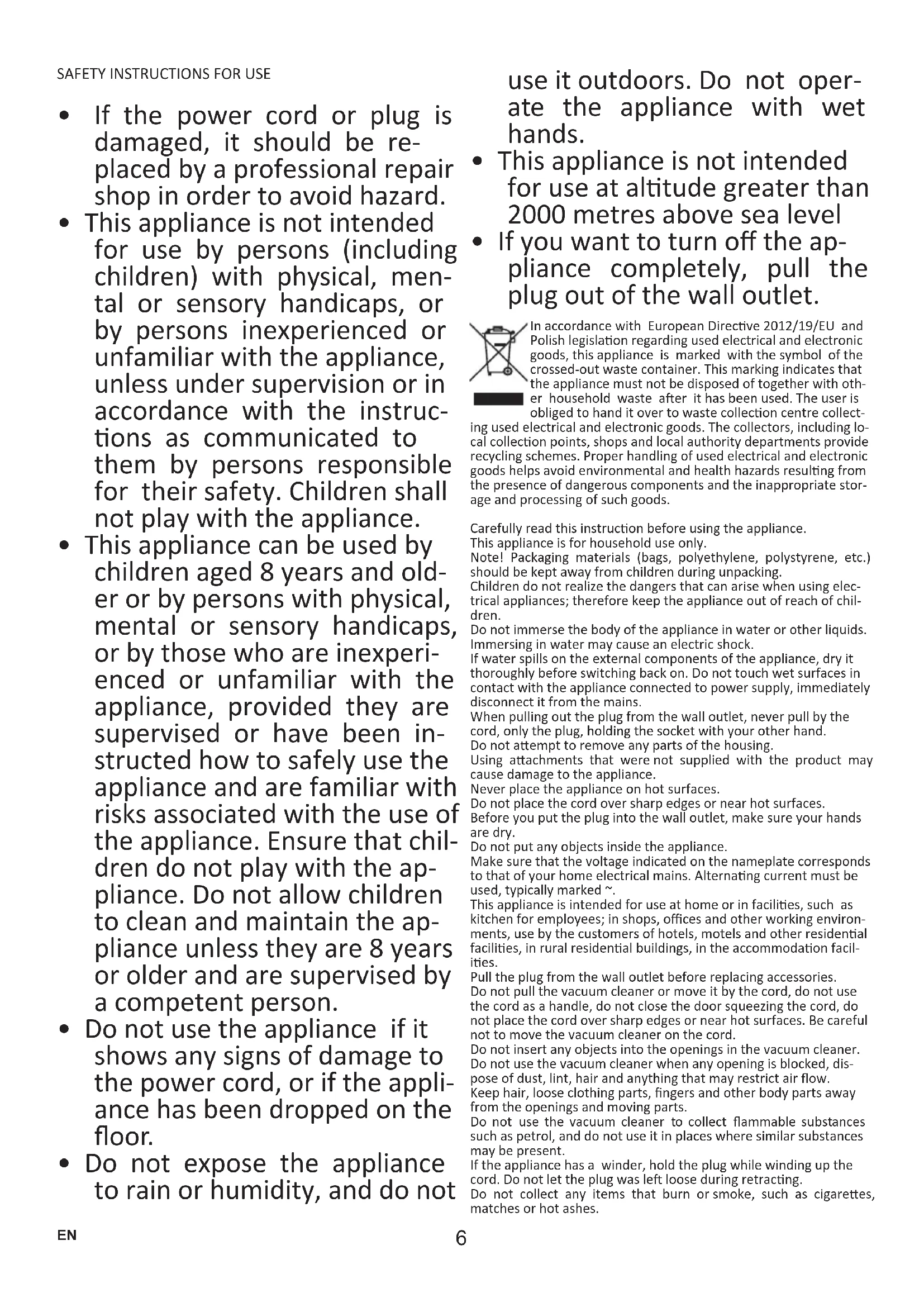 - If you want to turn o the ap- pliance completely, pull the plug out of the wall outlet. In accordance with European Direcve 2012/19/EU and Polish legislaon regarding used electrical and electronic goods, this appliance is marked with the symbol of the crossedout waste container. This marking indicates that the appliance must not be disposed of together with oth- er household waste aer it has been used. The user is obliged to hand it over to waste collecon centre collect- ing used electrical and electronic goods. The collectors, including lo- cal collecon points, shops and local authority departments provide recycling schemes. Proper handling of used electrical and electronic goods helps avoid environmental and health hazards resulng from the presence of dangerous components and the inappropriate stor- age and processing of such goods. Carefully read this instrucon before using the appliance. This appliance is for household use only. Note! Packaging materials (bags, polyethylene, polystyrene, etc.) should be kept away from children during unpacking. Children do not realize the dangers that can arise when using elec- trical appliances; therefore keep the appliance out of reach of chil- dren. Do not immerse the body of the appliance in water or other liquids. Immersing in water may cause an electric shock. If water spills on the external components of the appliance, dry it thoroughly before switching back on. Do not touch wet surfaces in contact with the appliance connected to power supply, immediately disconnect it from the mains. When pulling out the plug from the wall outlet, never pull by the cord, only the plug, holding the socket with your other hand. Do not aempt to remove any parts of the housing. Using aachments that were not supplied with the product may cause damage to the appliance. Never place the appliance on hot surfaces. Do not place the cord over sharp edges or near hot surfaces. Before you put the plug into the wall outlet, make sure your hands are dry. Do not put any objects inside the appliance. Make sure that the voltage indicated on the nameplate corresponds to that of your home electrical mains. Alternang current must be used, typically marked ~. This appliance is intended for use at home or in facilies, such as kitchen for employees; in shops, oces and other working environ- ments, use by the customers of hotels, motels and other residenal facilies, in rural residenal buildings, in the accommodaon facil- ies. Pull the plug from the wall outlet before replacing accessories. Do not pull the vacuum cleaner or move it by the cord, do not use the cord as a handle, do not close the door squeezing the cord, do not place the cord over sharp edges or near hot surfaces. Be careful not to move the vacuum cleaner on the cord. Do not insert any objects into the openings in the vacuum cleaner. Do not use the vacuum cleaner when any opening is blocked, dis- pose of dust, lint, hair and anything that may restrict air ow. Keep hair, loose clothing parts, ngers and other body parts away from the openings and moving parts. Do not use the vacuum cleaner to collect ammable substances such as petrol, and do not use it in places where similar substances may be present. If the appliance has a winder, hold the plug while winding up the cord. Do not let the plug was le loose during retracng. Do not collect any items that burn or smoke, such as cigarees, matches or hot ashes. EN7 Do not use the vacuum cleaner without a dust bag and/or lters. If the opening, which sucks air, hose or telescopic tube are clogged, you should immediately turn o the vacuum cleaner Before restart- ing the vacuum cleaner, rst remove the blocking item. Do not use the vacuum cleaner too close to heaters, radiators, cig- aree bus, etc. Before using the vacuum cleaner, remove sharp objects from the oor to avoid damaging the dust bag. Do not collect ne parcles such as: our, gypsum, printer toners, etc., as this may clog lters and damage the vacuum cleaner. Make sure that extension tube is fully withdrawn before you put away your vacuum cleaner either in vercal or horizontal posion. SPECIFICATION: Power specicaon: AC 220240V / 50Hz Nominal power: 850W Maximum power: 900W Net weight: 4,8 kg / 4,9 kg* YOUR APPLIANCE: