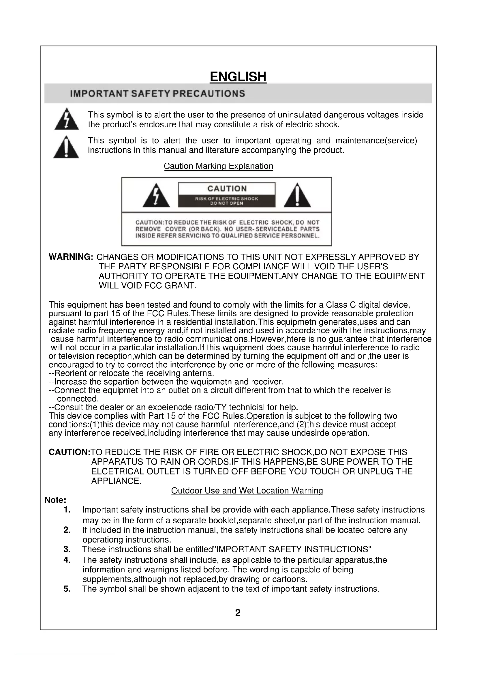 CAUTION:TO REDUCE THE RISK OF FIRE OR ELECTRIC SHOCK,DO NOT EXPOSE THIS APPARATUS TO RAIN OR CORDS. IF THIS HAPPENS,BE SURE POWER TO THE ELCETRICAL OUTLET IS TURNED OFF BEFORE YOU TOUCH OR UNPLUG THE APPLIANCE.