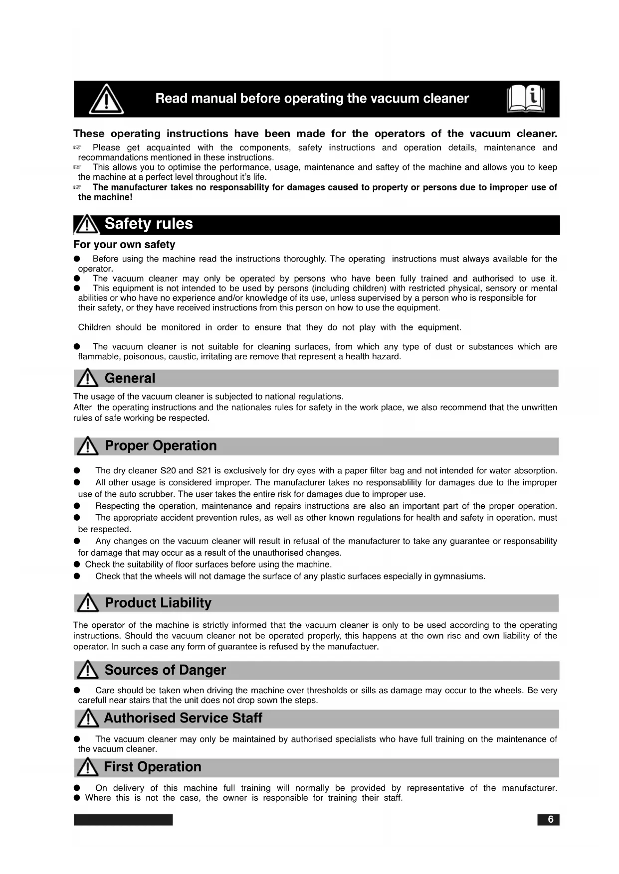 The operator of the machine is strictly informed that the vacuum cleaner is only to be used according to the operating instructions. Should the vacuum cleaner not be operated properly, this happens at the own risc and own liability of the operator. In such a case any form of guarantee is refused by the manufacturer.