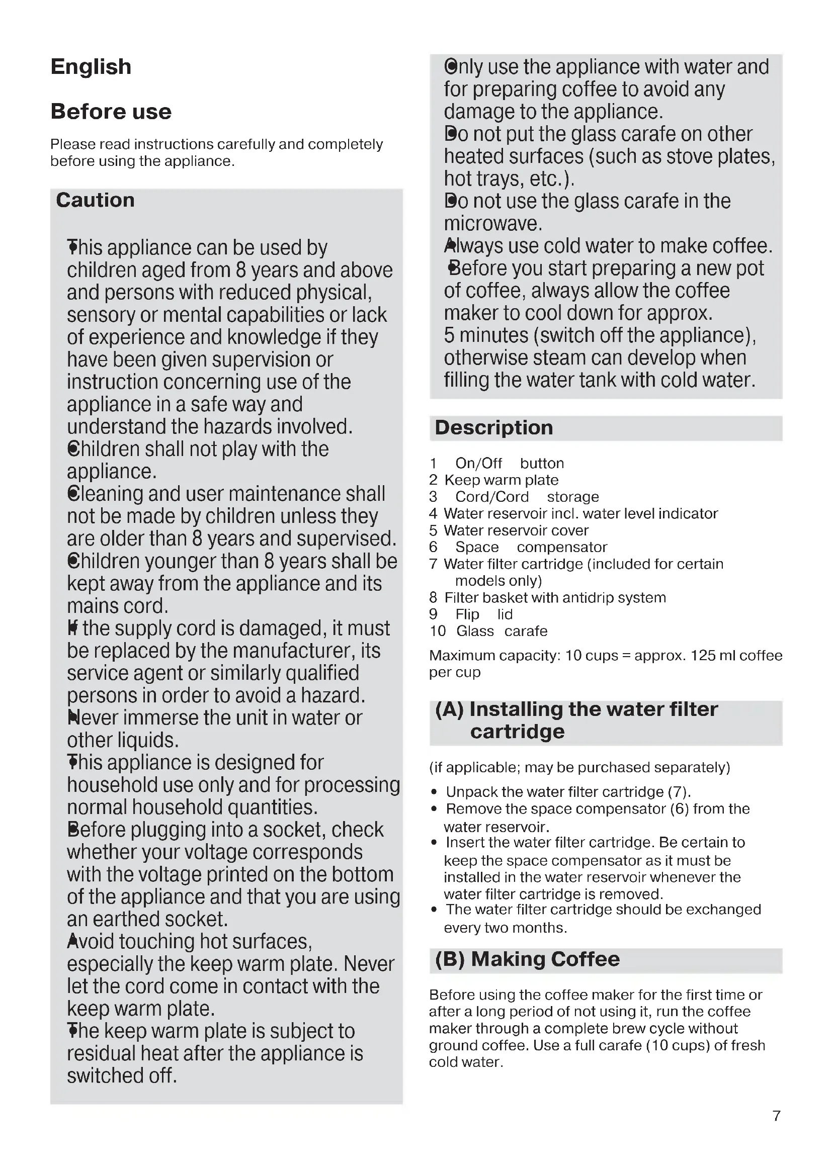 The ON/OFF button does not light up The appliance is unplugged. There was a power outage. ON/OFF button was not pressed Plug unit in. Wait for power to be restored. Press ON/OFF button Coffee is not brewing The appliance is unplugged. There was a power outage. ON/OFF button was not pressed Plug unit in. Wait for power to be restored. Press ON/OFF button There is no water in the reservoir Fill water into the reservoir Coffee making takes to long Coffee maker is calcified Decalcify the coffee maker The coffee maker is only brewing water There are no coffee grounds in the filter basket Add the desired amount of coffee to the filter The filter basket is overflowing The filter basket is not properly closed Close the filter basket correctly The carafe was not properly positioned on the keep warm plate Be sure the carafe is centered directly under the filter basket The lid is not on the carafe Place the lid on the carafe Carafe was removed for more than 20 seconds while the unit is brewing Carafe should be replaced promptly after removing Using too much coffee grounds Remove filter from the filter basket Replace the paper filter with a new one Restart the coffee brewing process with proper amount of coffee grounds (not more than 10 coffee scoops or tablespoons) Using coffee that is too finely Use only coffee that is ground for drip coffee makers Using the wrong paper filter size Use paper filter # 4 Coffee is not hot There was a power outage Wait for power to be restored 40 min. auto shut off has been activated There are coffee grounds at the bottom of the carafe The paper filter was not inserted correctly into the filter basket Rinse filter basket, set paper filter into the filter basket and restart brewing Paper filter collapsed Amount of brewed cups of coffee is less than initially cups of water filled in The amount of water gets lost in wetting the grounds and through evaporation during the brewing process Carafe indicates the water capacity and not the amount of coffee Subject to change without notice. Please do not dispose of the product in the household waste at the end of its useful life. Disposal can take place at a Braun Service Centre or at appropriate collection points provided in your country. Materials and accessories coming into contact with food conform to EEC regulation 1935/2004. 10Français Avant utilisation Lisez attentivement toutes les instructions avant d’utiliser l’appareil. Attention
