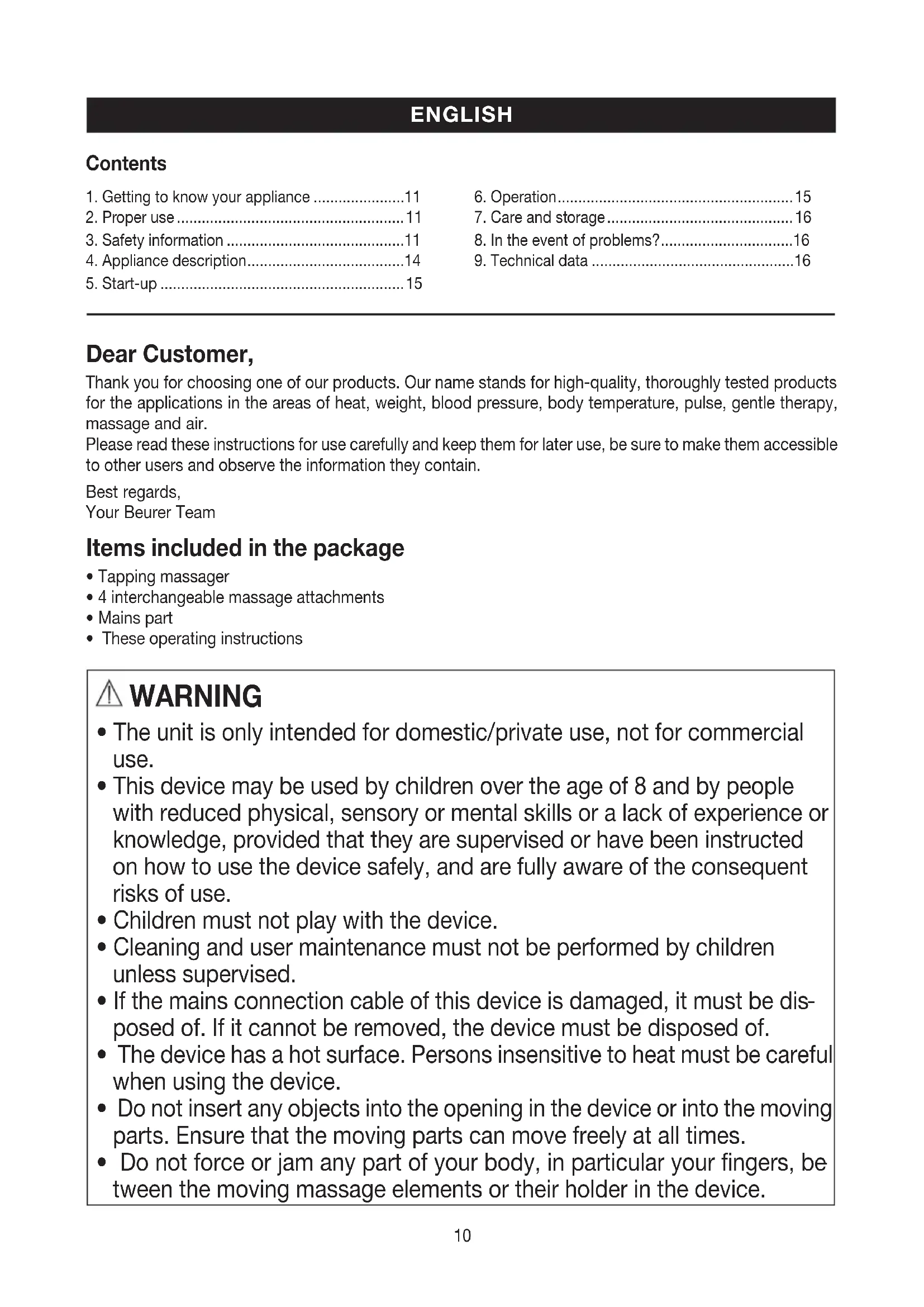- Keep the device dry. Note Do not use the massage device just before going to bed. The massage can also have a stimulating effect and may cause difficulties in getting off to sleep.16 WARNING