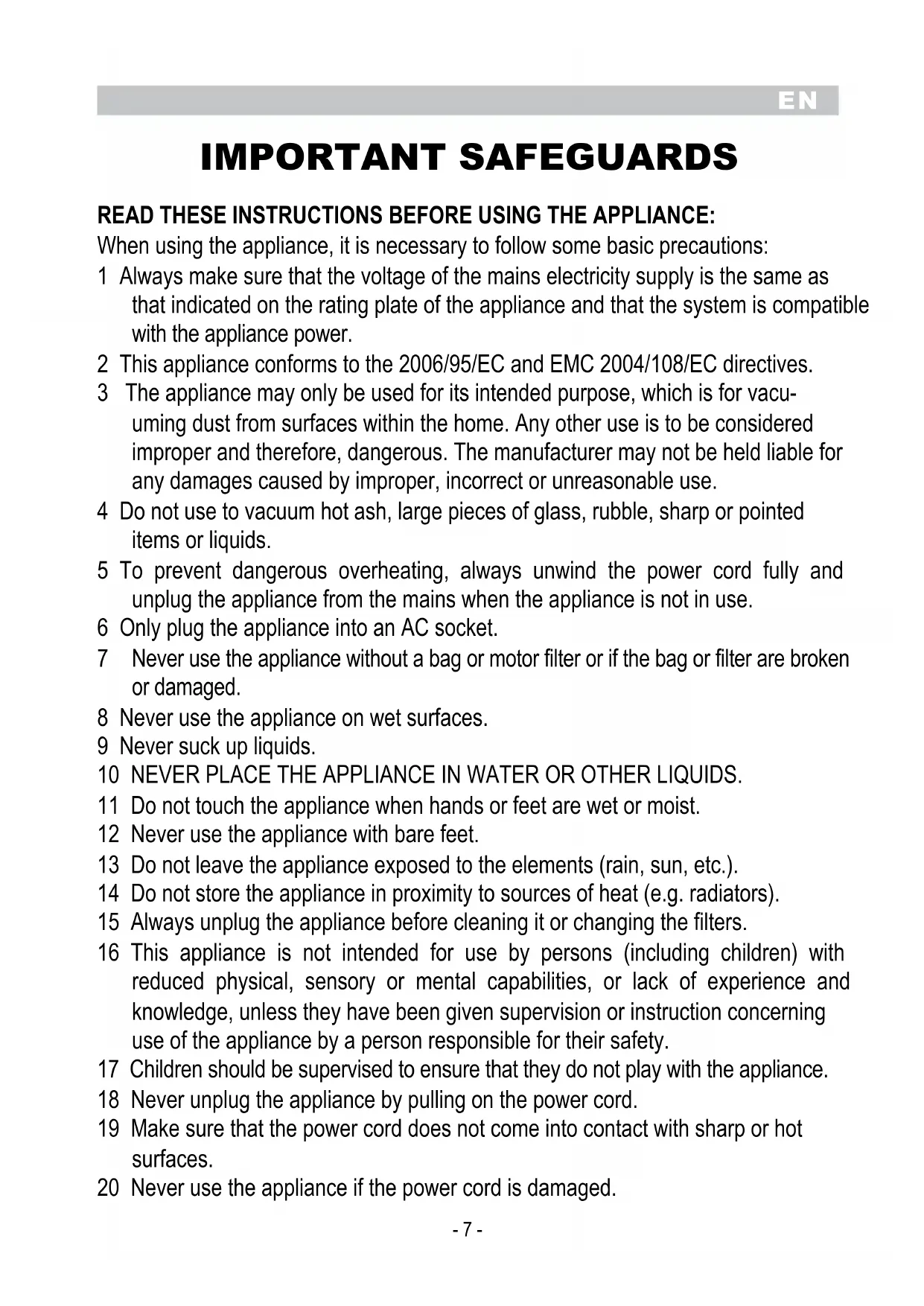 IMPORTANT SAFEGUARDS READ THESE INSTRUCTIONS BEFORE USING THE APPLIANCE: When using the appliance, it is necessary to follow some basic precautions: 1 Always make sure that the voltage of the mains electricity supply is the same as that indicated on the rating plate of the appliance and that the system is compatible with the appliance power. 2 This appliance conforms to the 2006/95/EC and EMC 2004/108/EC directives. 3 The appliance may only be used for its intended purpose, which is for vacu- uming dust from surfaces within the home. Any other use is to be considered improper and therefore, dangerous. The manufacturer may not be held liable for any damages caused by improper, incorrect or unreasonable use. 4 Do not use to vacuum hot ash, large pieces of glass, rubble, sharp or pointed items or liquids. 5 To prevent dangerous overheating, always unwind the power cord fully and unplug the appliance from the mains when the appliance is not in use. 6 Only plug the appliance into an AC socket.
