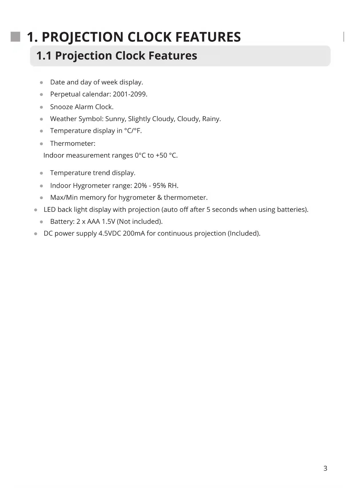 ● Date and day of week display. ● Perpetual calendar: 2001-2099. ● Snooze Alarm Clock. ● Weather Symbol: Sunny, Slightly Cloudy, Cloudy, Rainy. ● Temperature display in °C/°F. ● Thermometer: Indoor measurement ranges 0°C to +50 °C. ● Temperature trend display. ● Indoor Hygrometer range: 20% - 95% RH. ● Max/Min memory for hygrometer & thermometer. ● LED back light display with projection (auto o after 5 seconds when using batteries). ● Battery: 2 x AAA 1.5V (Not included). ● DC power supply 4.5VDC 200mA for continuous projection (Included).2. IMPORTANT INFORMATION