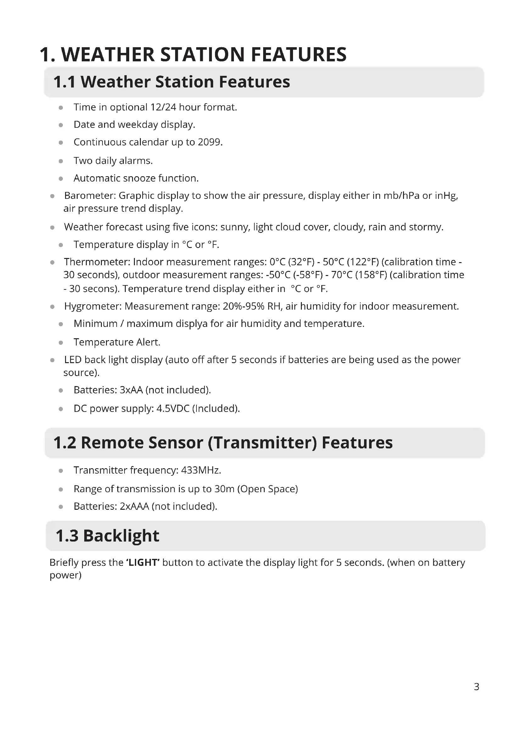 ● Time in optional 12/24 hour format. ● Date and weekday display. ● Continuous calendar up to 2099. ● Two daily alarms. ● Automatic snooze function. ● Barometer: Graphic display to show the air pressure, display either in mb/hPa or inHg, air pressure trend display. ● Weather forecast using ve icons: sunny, light cloud cover, cloudy, rain and stormy. ● Temperature display in °C or °F. ● Thermometer: Indoor measurement ranges: 0°C (32°F) - 50°C (122°F) (calibration time - 30 seconds), outdoor measurement ranges: -50°C (-58°F) - 70°C (158°F) (calibration time - 30 secons). Temperature trend display either in °C or °F. ● Hygrometer: Measurement range: 20%-95% RH, air humidity for indoor measurement. ● Minimum / maximum displya for air humidity and temperature. ● Temperature Alert. ● LED back light display (auto o after 5 seconds if batteries are being used as the power source). ● Batteries: 3xAA (not included). ● DC power supply: 4.5VDC (Included).