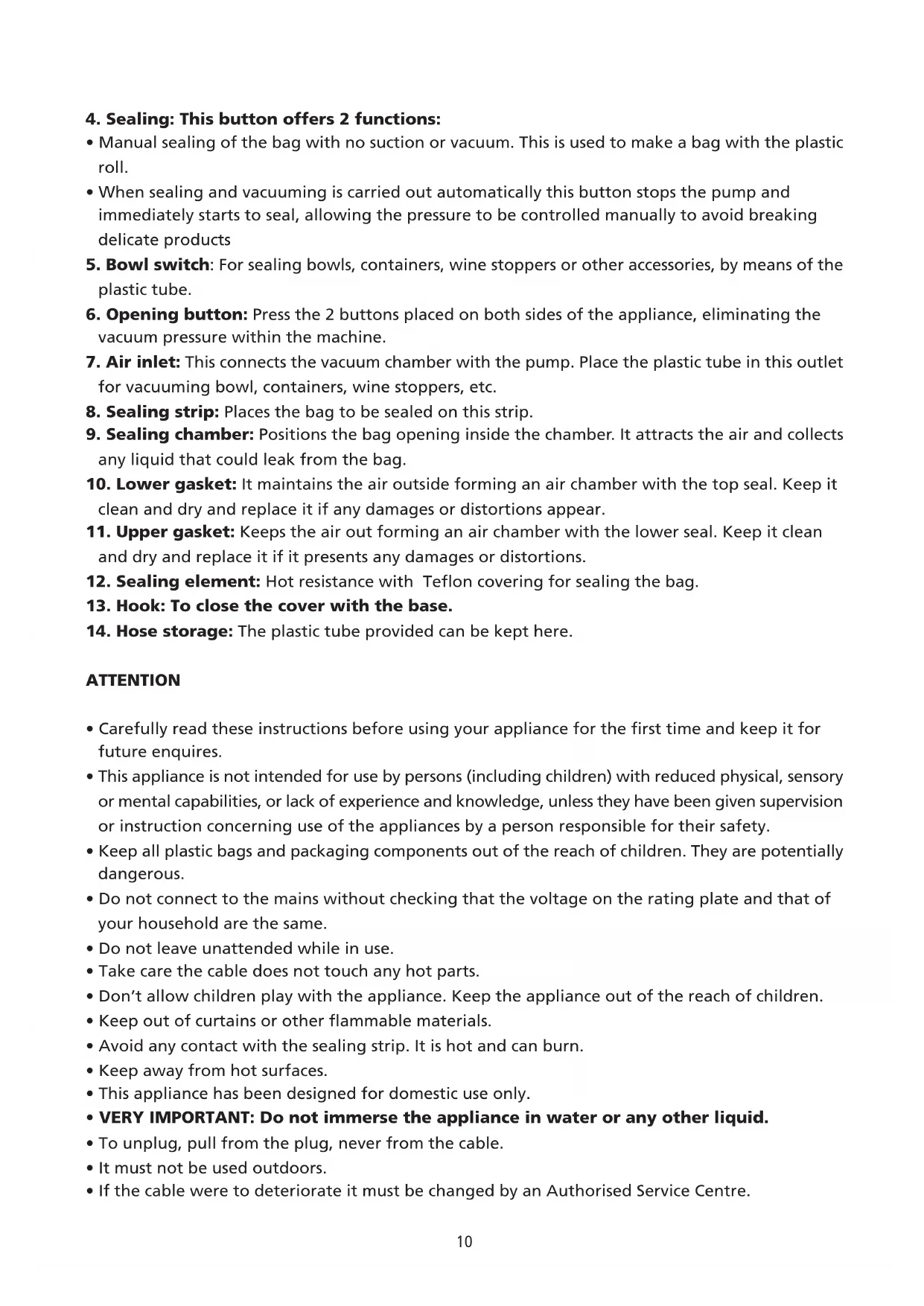 - Do not carry out the sealing function continuously to avoid overheating the heating element. The machine will reject the function if the “sealing” button is activated 15 seconds from the last time.