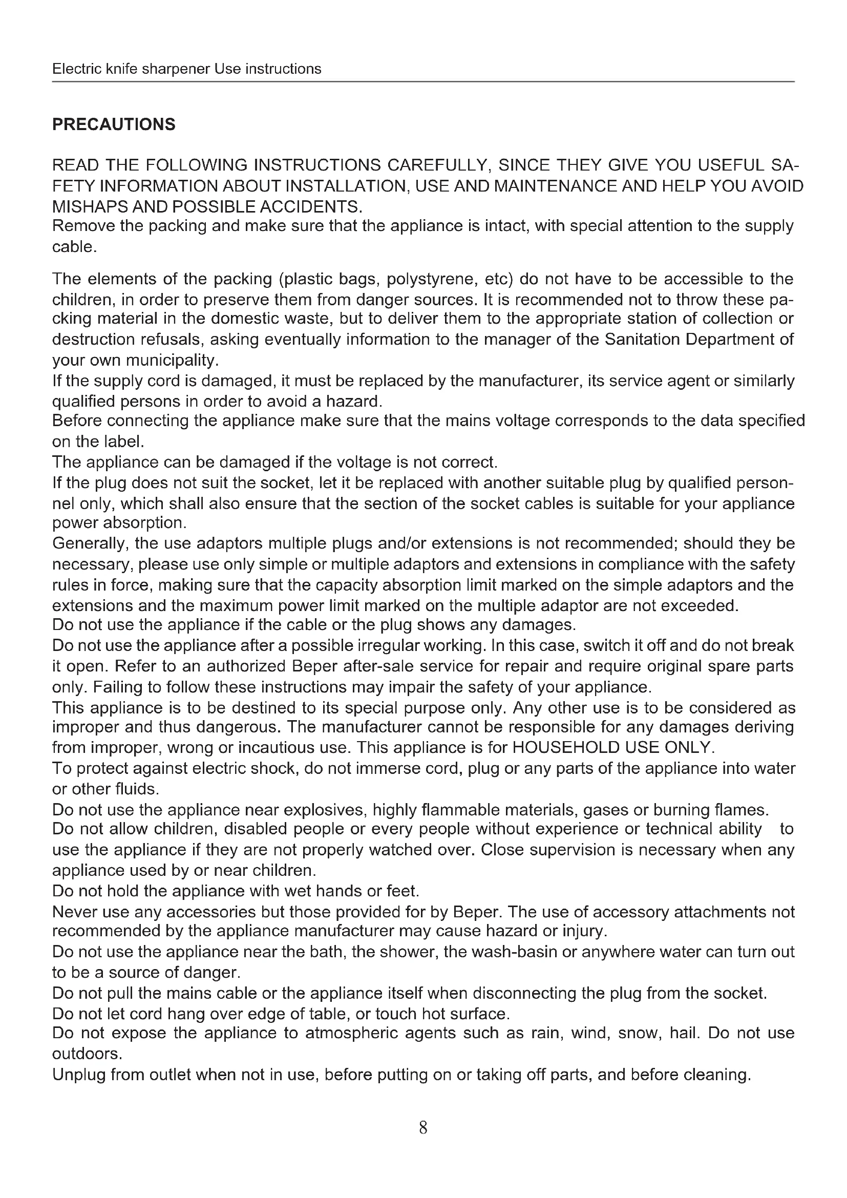 Do not use the appliance after a possible irregular working. In this case, switch it off and do not break it open. Refer to an authorized Beper after-sale service for repair and require original spare parts only. Failing to follow these instructions may impair the safety of your appliance.