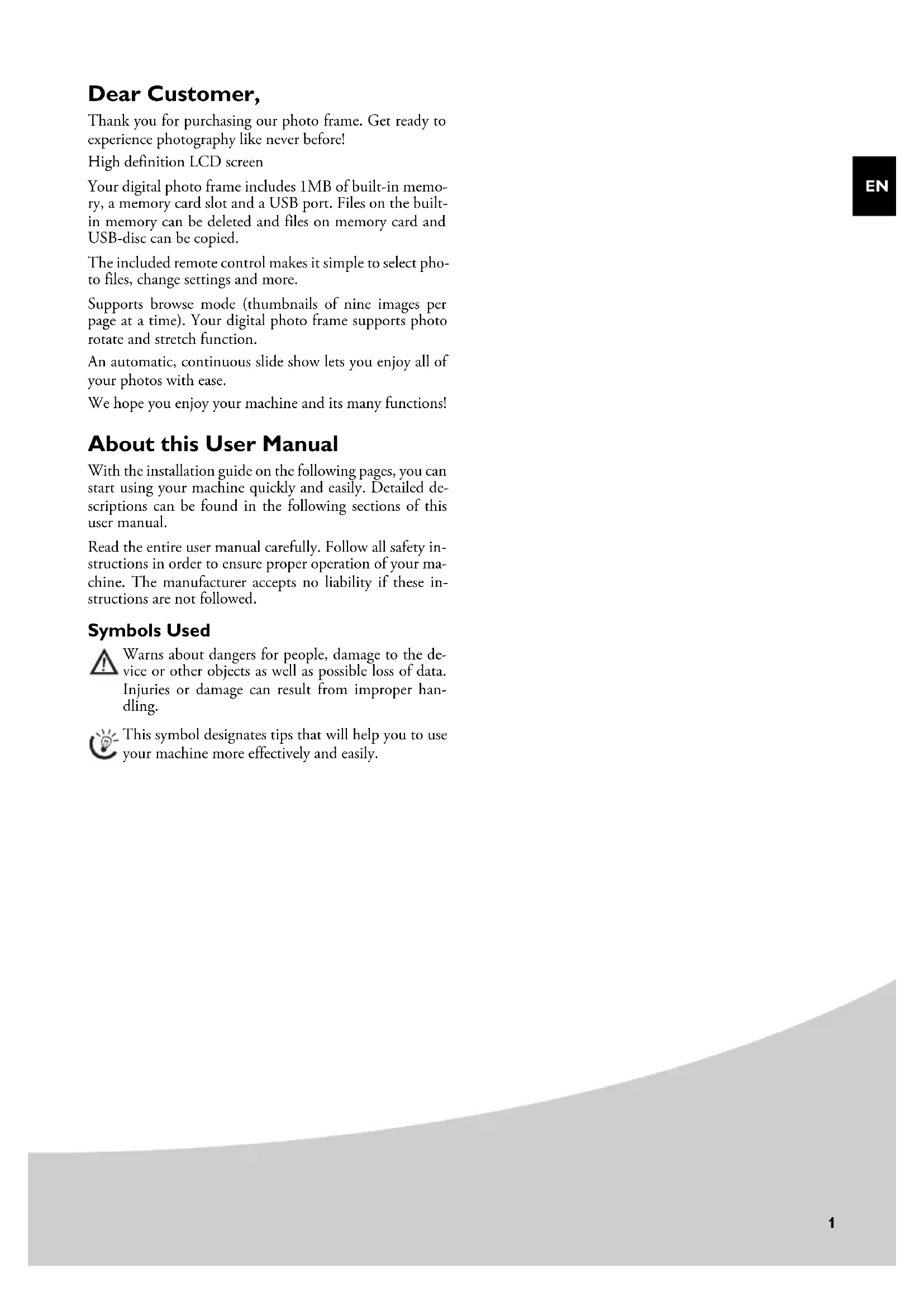 Your digital photo frame includes 1MB of built-in memory, a memory card slot and a USB port. Files on the built-in memory can be deleted and files on memory card and USB-disc can be copied.