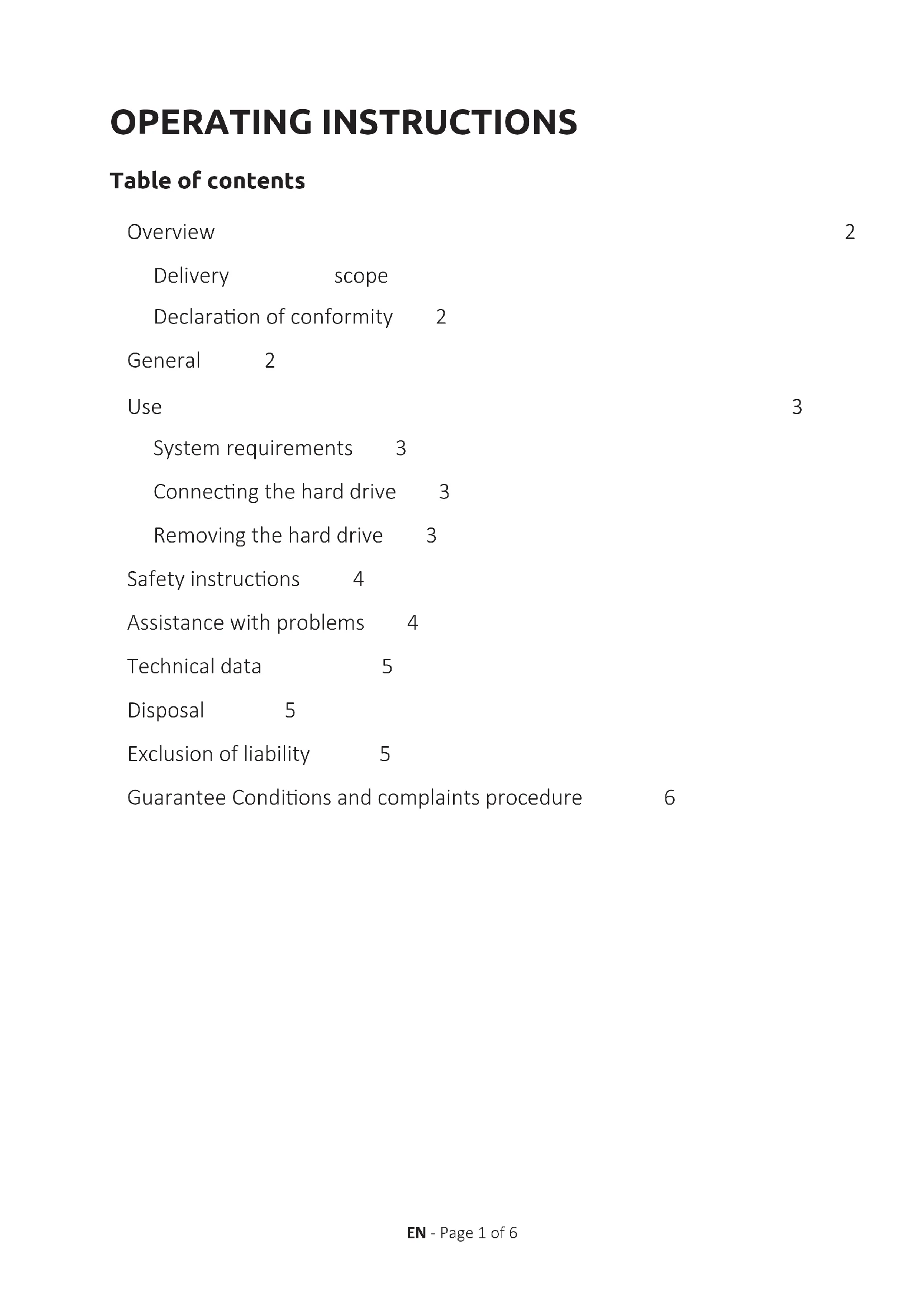Check the external hard drive and the USB cable for visible damages. Should there be damage please contact our Support to exchange it. Under no circumstances use the defecve device or cable. Check that the cable connecon is plugged correctly. Status LED is not illuminated EN - Page 4 of 6 SAFETY INSTRUCTIONS Children oen underesmate dangers or do not recognise them at all. This device is not intended to be used by persons (including children) with restricted sensory, physical or mental abilies or lack of experience and/or knowledge, unless they are supervised by a person responsible for their safety or received instrucons from the person on how to use the device and they have understood the resultant dangers. Unsupervised children should not have access to the device. Make sure that children do not play with the device. Dangers for children and persons with restricted physical, sensory or mental abilities: Check the points under “Status LED is not illuminated” rst. Hard Drive is not recognizedEN - Page 5 of 6 Please check all further USB ports of your device (in parcular on the rear side of PCs), it is possible that the hard drive does not get enough power at the used USB port. Please use only the supplied cable and, in parcular, no extension. If you use a USB hub between hard drive and computer, this should have an own power supply. If the hard drive is not recognized at any USB port of your device, please try if it works on another device to exclude a possible defect. Check the Disk Management, it is possible that only a drive leer has to be assigned (please see the Help le of your Windows version). If you have used the hard drive previously, for example on a TV set, it could be that you have to format the hard drive rst so that you can use it on a computer again (please refer to the ope- rang instrucons of the previously used device and/or the Help le of your operang system provider for details). TECHNICAL DATA EXTERNAL USB 3.0 HARD DRIVE 2.5“ (6.35CM) Dimensions (2.5“ housing): 11 / 13 / 17 / 20 x 78 x 127 mm Transfer rate: max. 5 GBit/sec (USB 3.0) Capacity calculaon: 1 MB = 1,000,000 bytes/ 1 GB = 1,000,000,000 bytes Disposal of old electronic equipment: The devices marked with this symbol are subject to the European Direcve 2012/19/EC. All electrical appliances and old electrical appliances must be disposed of separate from the municipal waste stream via designated collec- on facilies appointed by the government or the local authories.You avoid environmental damage with the proper disposal of old electrical equipment. Packaging: Packaging is raw material. The packaging material of this product is suitable for recycling and can be re-used. Please pay aenon to the local recycling provisions when disposing of any materials. DISPOSAL