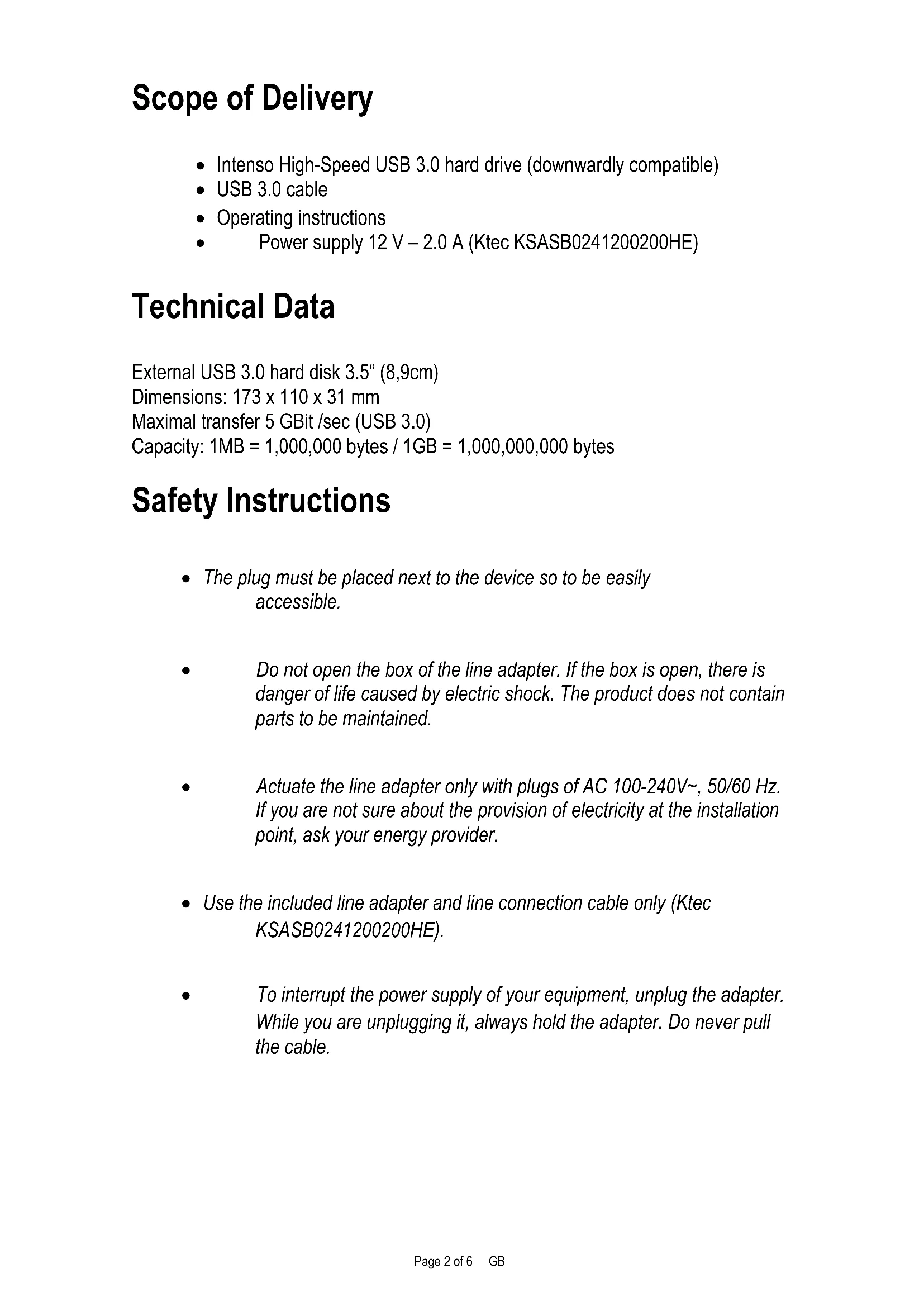 3.5“ MEMORYBOARDPage 2 of 6 GB Scope of Delivery Intenso High-Speed USB 3.0 hard drive (downwardly compatible) USB 3.0 cable Operating instructions Power supply 12 V – 2.0 A (Ktec KSASB0241200200HE) Technical Data External USB 3.0 hard disk 3.5“ (8,9cm) Dimensions: 173 x 110 x 31 mm Maximal transfer 5 GBit /sec (USB 3.0) Capacity: 1MB = 1,000,000 bytes / 1GB = 1,000,000,000 bytes Safety Instructions The plug must be placed next to the device so to be easily accessible. Do not open the box of the line adapter. If the box is open, there is danger of life caused by electric shock. The product does not contain parts to be maintained. Actuate the line adapter only with plugs of AC 100-240V~, 50/60 Hz. If you are not sure about the provision of electricity at the installation point, ask your energy provider. Use the included line adapter and line connection cable only (Ktec KSASB0241200200HE). To interrupt the power supply of your equipment, unplug the adapter. While you are unplugging it, always hold the adapter. Do never pull the cable.Page 3 of 6 GB Instructions for use