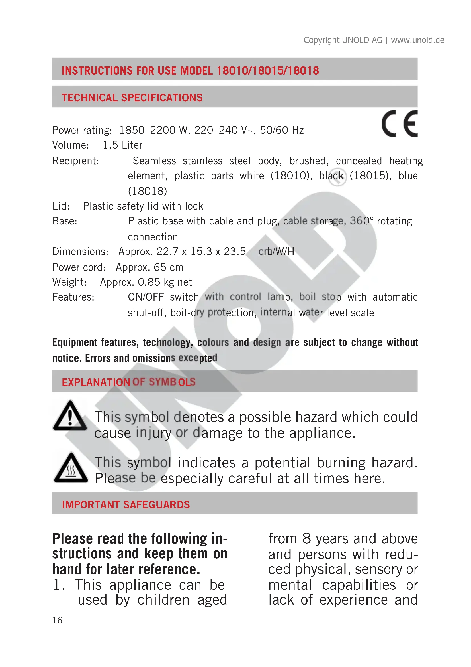 This symbol denotes a possible hazard which could cause injury or damage to the appliance. This symbol indicates a potential burning hazard. Please be especially careful at all times here. Power rating: 1850–2200 W, 220–240 V~, 50/60 Hz Volume: 1,5 Liter Recipient: Seamless stainless steel body, brushed, concealed heating element, plastic parts white (18010), black (18015), blue (18018) Lid: Plastic safety lid with lock Base: Plastic base with cable and plug, cable storage, 360° rotating connection Dimensions: Approx. 22.7 x 15.3 x 23.5 cm L/W/H Power cord: Approx. 65 cm Weight: Approx. 0.85 kg net Features: ON/OFF switch with control lamp, boil stop with automatic shut-off, boil-dry protection, internal water level scale Equipment features, technology, colours and design are subject to change without notice. Errors and omissions excepted Copyright UNOLD AG | www.unold.de17 knowledge if they have been given supervision or instruction concer- ning use of the appli- cance in a safe way and understand the hazards involved. Children shall not play with the appli- ance. Cleaning and user maintenance shall not be made by children without supervision.