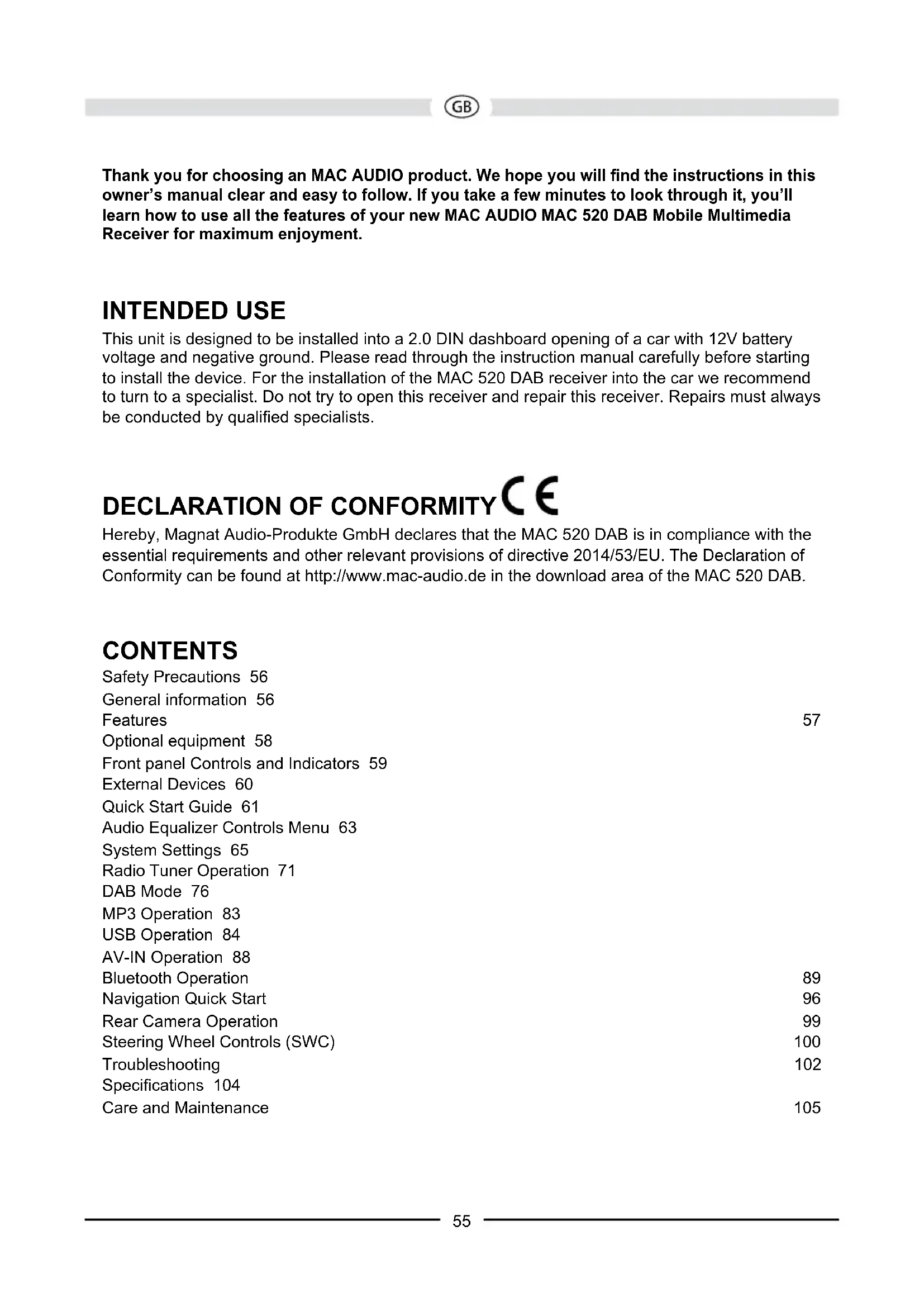 Hereby, Magnat Audio-Produkte GmbH declares that the MAC 520 DAB is in compliance with the essential requirements and other relevant provisions of directive 2014/53/EU. The Declaration of Conformity can be found at http://www.mac-audio.de in the download area of the MAC 520 DAB. CONTENTS Safety Precautions 56 General information 56 Features 57 Optional equipment 58 Front panel Controls and Indicators 59 External Devices 60 Quick Start Guide 61 Audio Equalizer Controls Menu 63 System Settings 65 Radio Tuner Operation 71 DAB Mode 76 MP3 Operation 83 USB Operation 84 AV-IN Operation 88 Bluetooth Operation 89 Navigation Quick Start 96 Rear Camera Operation 99 Steering Wheel Controls (SWC) 100 Troubleshooting 102 Specications 104 Care and Maintenance 105 55SAFETY PRECAUTIONS