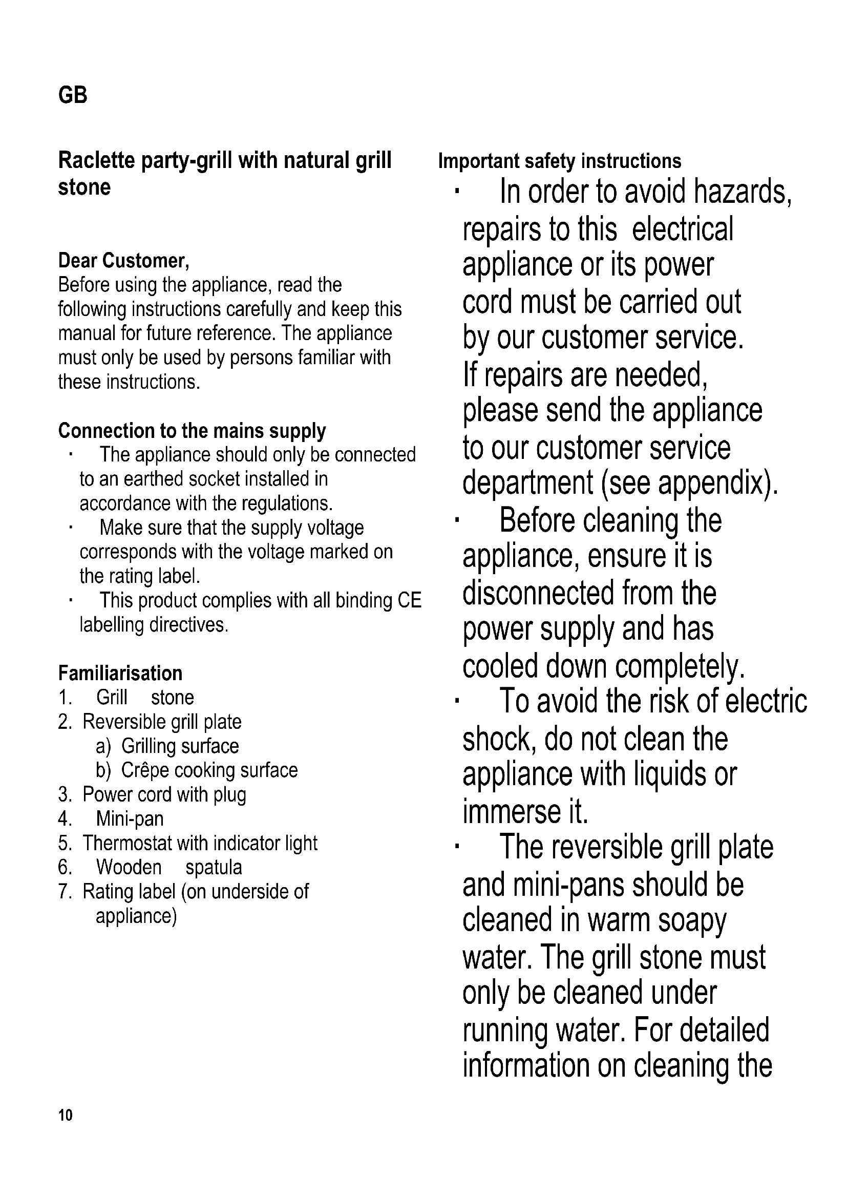 appliance) Important safety instructions ∙ In order to avoid hazards, repairs to this electrical appliance or its power cord must be carried out by our customer service. If repairs are needed, please send the appliance to our customer service department (see appendix). ∙ Before cleaning the appliance, ensure it is disconnected from the power supply and has cooled down completely. ∙ To avoid the risk of electric shock, do not clean the appliance with liquids or immerse it. ∙ The reversible grill plate and mini-pans should be cleaned in warm soapy water. The grill stone must only be cleaned under running water. For detailed information on cleaning the GB11 appliance, please refer to the section Cleaning and care. ∙ The appliance is not intended to be operated by means of an external timer or separate remote-control system. ∙ This appliance is intended for domestic or similar applications, such as - in staff kitchens in shops, offi ces and other similar working environments, - in agricultural working environments, - by customers in hotels, motels etc. and similar accommodation, - in bed-and breakfast type environments. ∙ This appliance may be used by children (at least 8 years of age) and by persons with reduced physical, sensory or mental capabilities, or lacking experience and knowledge, provided they have been given supervision or instruction concerning the use of the appliance and fully understand all dangers and safety precautions involved. ∙ Children must not be permitted to play with the appliance. ∙ Children must not be permitted to carry out any cleaning or maintenance work on the appliance unless they are supervised and at least 8 years of age. ∙ The appliance and its power cord must be kept well away from children under 8 at all times. ∙ Caution: Keep children away from any packaging materials– these are a potential source of danger, e.g. of suffocation. ∙ Every time the appliance is used, the main body including the power cord as well as any attachment fi tted should be checked thoroughly for any defects.12 Should the appliance, for instance, have been dropped onto a hard surface, or if excessive force has been used to pull the power cord, it must no longer be used: even invisible damage may have adverse effects on the operational safety of the appliance. ∙ The surfaces of the appliance, the reversible grill plate, grill stone and mini- pans become hot during use. Caution: There is a danger of burns. ∙ Do not leave the appliance unattended while in use. ∙ Do not allow the power cord to touch any hot part of the appliance. ∙ During operation, the appliance must be placed on a heat-resistant, stable and level surface, impervious to splashes and stains. When cooking food with a high fat or moisture content, splashes are not always avoidable. ∙ Do not position the grill next to a wall or corner, and ensure that no infl ammable materials are stored near it. ∙ Do not position the appliance on or near hot surfaces, open fl ames or infl ammable vapours. ∙ Caution: Do not operate the appliance outdoors. ∙ Before use, the reversible grill plate and the grill stone must be placed on top of the appliance over the heating element. ∙ Always remove the plug from the wall socket - after use, - in case of any malfunction, and - before cleaning the appliance. ∙ When removing the plug from the wall socket, never pull on the power cord; always grip the plug itself. ∙ No responsibility will be accepted if damage results from improper use, or if these instructions are not complied with. Applications This appliance is an electric raclette grill, suitable for low-fat grilling of meat, fi sh and vegetables, for cheese ‘au gratin’ and for making crêpes. Any use other than that described in these instructions must be considered improper and may lead to personal injury or material damage. Before fi rst use ∙ Remove any packing materials completely. ∙ Before using the grill for the fi rst time, clean the reversible grill plate, grill stone and mini-pans with a damp cloth. ∙ Heat up the appliance with the stone / plate and mini-pans for about 10 minutes, without any food, to eliminate the smell typically encountered when fi rst switching on a grill (a small amount of smoke may be noticeable). For that reason, adequate ventilation should be ensured by opening windows or balcony doors. ∙ Clean the appliance afterwards as described in Cleaning and care. Grill stone ∙ Fit the stone, with the smooth side up, next to the reversible grill plate on the appliance. Caution: Avoid placing a cold stone onto a hot element. ∙ The stone can be used for cooking vegetables, sliced meat or fi sh etc. as13 required. ∙ This stone is entirely natural material. Small cracks resulting from natural expansion and contraction during heating and cooling, as well as a change to a darker colour are normal and have no detrimental effects. ∙ Do not place any frozen food or items containing vinegar (such as pickled gherkins or mustard) on the stone. Reversible grill plate ∙ Fit the reversible grill plate next to the stone on the appliance. ∙ With the smooth side up, the reversible grill plate can be used for grilling in the normal way. With the ribbed side facing upwards, the grill plate can be used for grilling in the normal way. The grill plate should be lightly greased before use. The reverse side is suitable for cooking 4 small crêpes or pancakes. Variable thermostat and indicator light ∙ If the thermostat control is set all the way to the right, the heating element remains on. But if the thermostat is moved to the left, the element will switch off and on alternately. ∙ The red indicator light remains lit as long as the heating element is on. ∙ After use, return the thermostat to its lowest setting and unplug the appliance from the mains supply. Operation Hint: For the very best results, meat should be taken from the refrigerator about half an hour before g