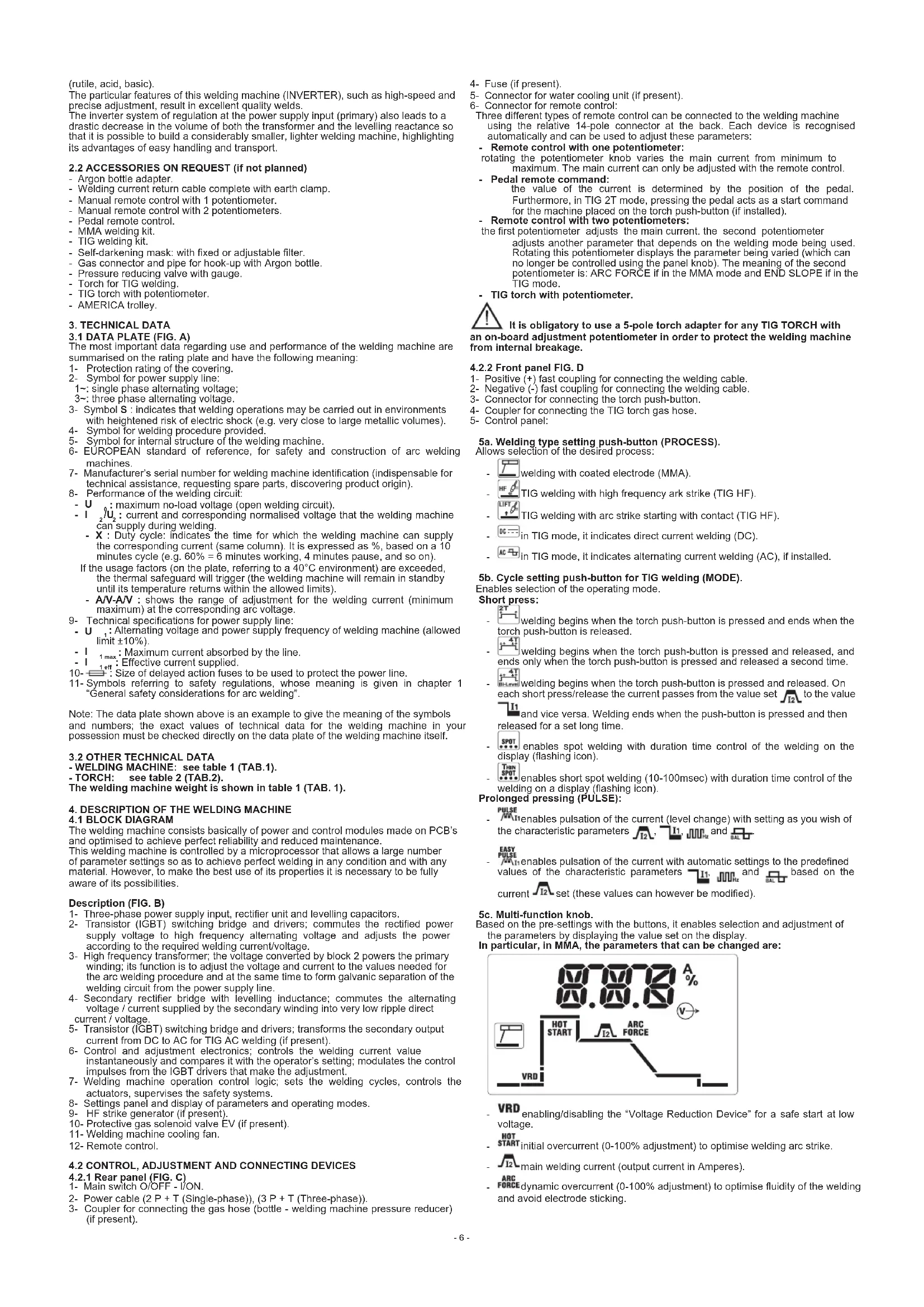 8.TROUBLESHOOTING...........................................................................................8 page page- 6 - (rutile, acid, basic). The particular features of this welding machine (INVERTER), such as high-speed and precise adjustment, result in excellent quality welds. The inverter system of regulation at the power supply input (primary) also leads to a drastic decrease in the volume of both the transformer and the levelling reactance so that it is possible to build a considerably smaller, lighter welding machine, highlighting its advantages of easy handling and transport. 2.2ACCESSORIESONREQUEST(ifnotplanned) - Argon bottle adapter. - Welding current return cable complete with earth clamp. - Manual remote control with 1 potentiometer. - Manual remote control with 2 potentiometers. - Pedal remote control. - MMA welding kit. - TIG welding kit. - Self-darkening mask: with xed or adjustable lter. - Gas connector and pipe for hook-up with Argon bottle. - Pressure reducing valve with gauge. - Torch for TIG welding. - TIG torch with potentiometer. - AMERICA trolley. 3.TECHNICALDATA 3.1DATAPLATE(FIG.A) The most important data regarding use and performance of the welding machine are summarised on the rating plate and have the following meaning: