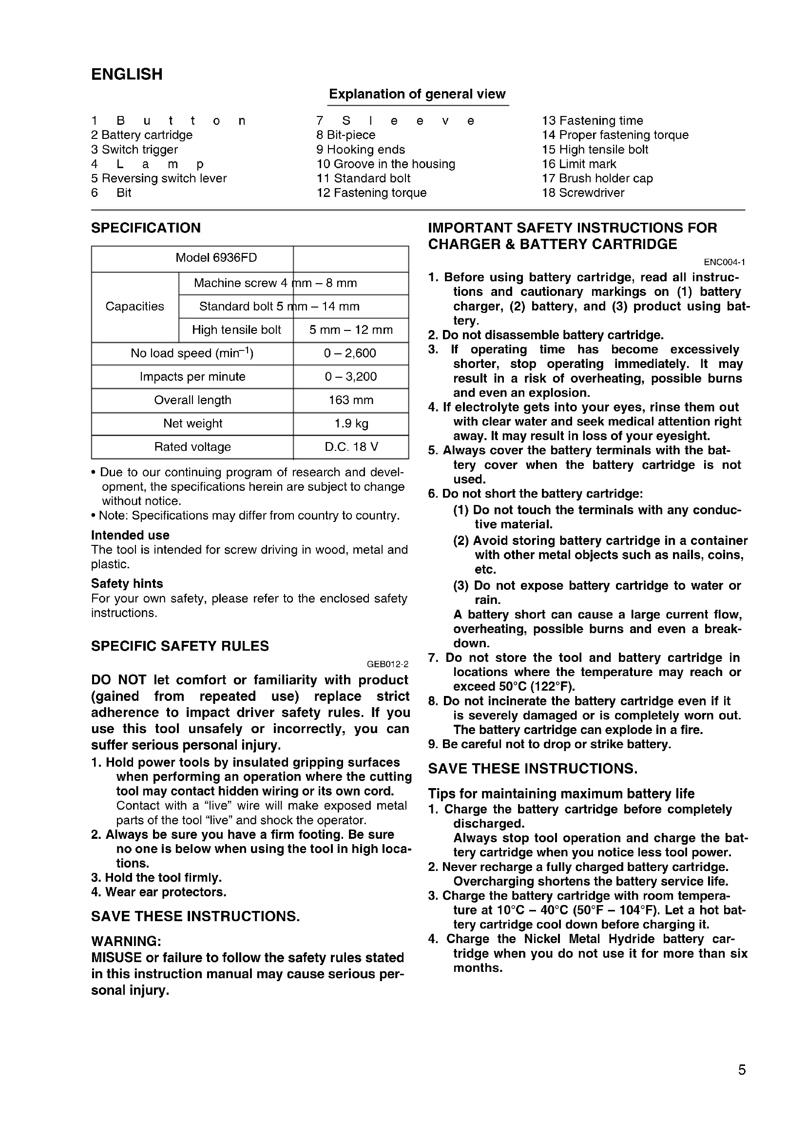 tridge when you do not use it for more than six months. Model 6936FD Capacities Machine screw 4 mm – 8 mm Standard bolt 5 mm – 14 mm High tensile bolt 5 mm – 12 mm No load speed (min