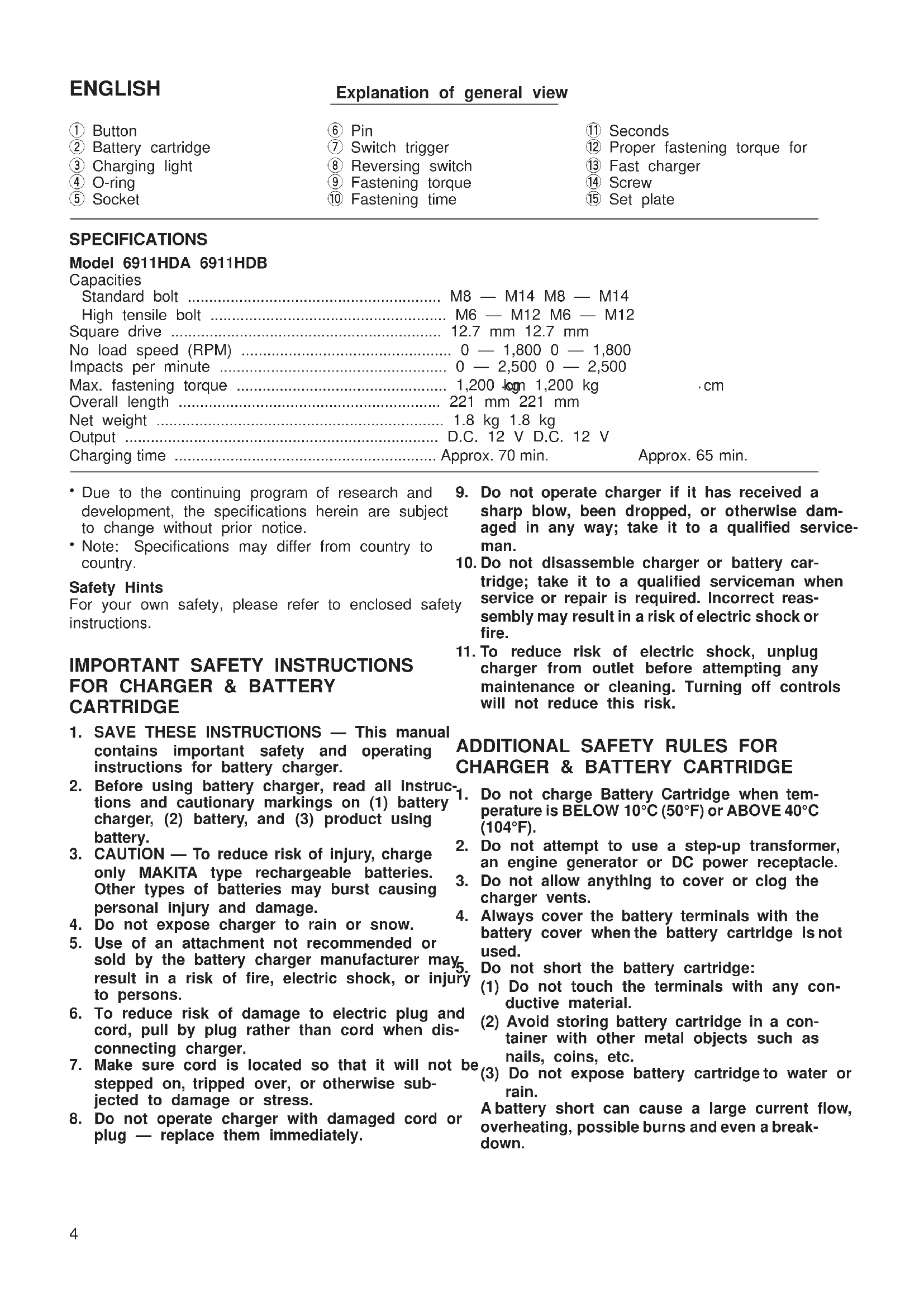 6911HDA/6911HDWA (Eng) (’98. 12. 18)6. Do not store the machine and Battery Car- tridge in locations where the temperature may reach or exceed 50°C (122°F).