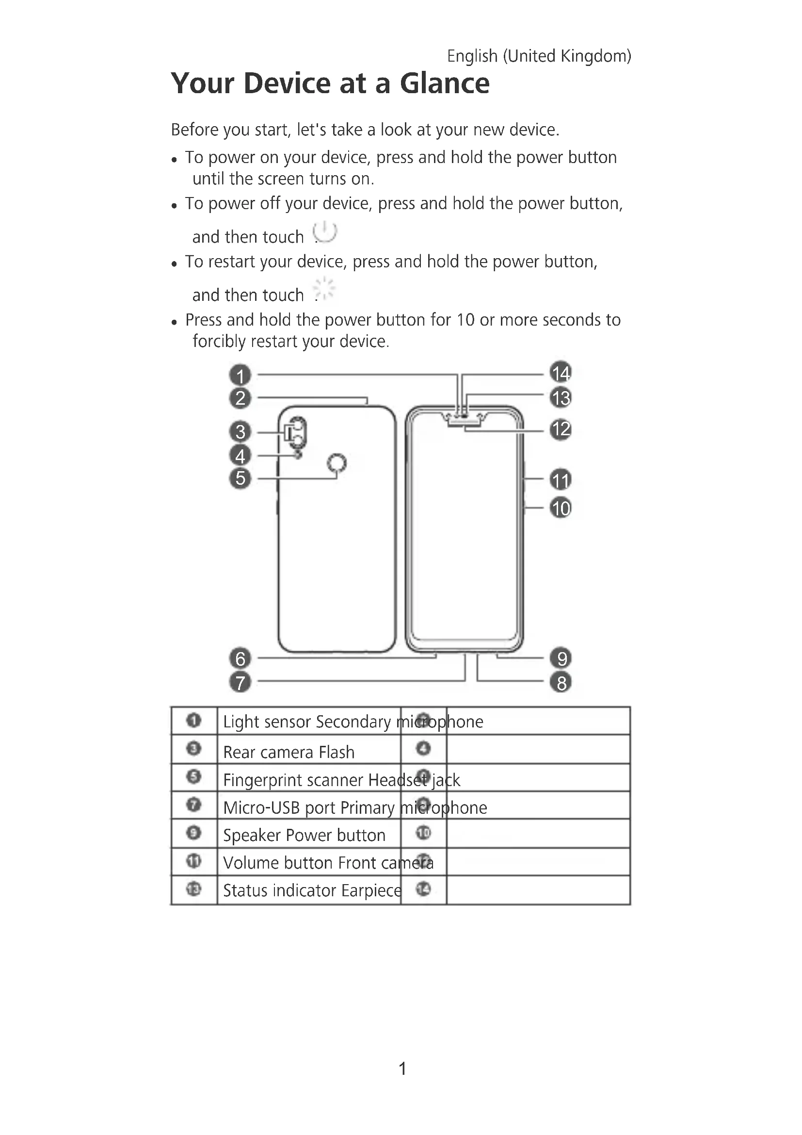 2Dual Card Dual Standby Single Pass (dual-SIM devices only) Your device supports only dual card dual standby single pass, which means you cannot use both SIM cards for calls or data services simultaneously. l When you are on a call using SIM card 1, SIM card 2 cannot be used to make or answer calls. If someone calls SIM card 2, the caller will hear a voice message similar to "The subscriber you dialled is out of the service area" or "The subscriber you dialled cannot be connected for the moment, please try again later." The actual message will vary by service provider. l When you are using SIM card 1's data service, SIM card 2's data service will be disabled. Your device's single pass feature helps reduce power consumption and increase your device's standby time. It is not related to your service provider's network conditions. You can go to Settings > Wireless & networks > Dual SIM settings, and enable Enable call forwarding between SIMs to avoid the conicts mentioned above. 3For More Information If you encounter any problems whilst using your device, you can get help from the following resources: l Go to Tips for function details and usage tips. l Visit http://consumer.huawei.com/en to view device information, frequently asked questions and other information. l Visit http://consumer.huawei.com/en/support for the most up-to-date contact information for your country or region. l You can nd service hotlines, retailer addresses, service policies and more information for your local region in HiCare. Go to Settings and touch System > About phone > Legal to view legal information for your product. Go to Settings and touch System > About phone > Legal > Safety information to view safety information for your product. Go to Settings and touch System > About phone > Authentication info to view regulatory information for your product. All pictures and illustrations in this guide, including but not limited to the device colour, size, and display content, are for your reference only. The actual device may vary. Nothing in this guide constitutes a warranty of any kind, express or implied. 4Safety Information Please read all of the safety information carefully before using your device to ensure its safe and proper operation and to learn how to dispose of your device properly. Operation and Safety l To prevent possible hearing damage, do not listen at high volume levels for long periods. l Using an unapproved or incompatible power adapter, charger or battery may damage your device, shorten its lifespan or cause a re, explosion or other hazards. l Ideal operating temperatures are 0 °C to 35 °C. Ideal storage temperatures are -20 °C to +45 °C. l Pacemaker manufacturers recommend maintaining a minimum distance of 15 cm between a pacemaker and a wireless device to prevent potential interference with the pacemaker. If using a pacemaker, hold the device on the side opposite the pacemaker and do not carry the device in your front pocket. l Keep the device and the battery away from excessive heat and direct sunlight. Do not place them on or in heating devices, such as microwave ovens, stoves or radiators. l Adhere to local laws and regulations while using the device. To reduce the risk of accidents, do not use your device while driving. l While ying in an aircraft or immediately before boarding, ensure that you use your device according to the instructions provided. Using a wireless device in an aircraft may disrupt wireless networks, present a hazard to aircraft operations or be illegal under law. l To prevent damage to your device's parts or internal circuits, do not use it in dusty, smoky, damp or dirty environments or near magnetic elds. l When charging the device, make sure the power adapter is plugged into a socket near the devices and is easily accessible. l Unplug the charger from the electric socket and from the device when not in use. l Do not use, store or transport the device where ammables or explosives are stored (e.g. in a petrol station, oil depot or 5chemical plant). Using your device in these environments increases the risk of explosion or re. l Dispose of this device, the battery and accessories according to local regulations. They should not be disposed of in normal household waste. Improper battery use may lead to re, explosion or other hazards. l Please consult your doctor and the device manufacturer to determine if operation of your device may interfere with the operation of your medical device. l Adhere to any rules or regulations set forth by hospitals and health care facilities. l If you must make or answer a call, stop your vehicle at a safe location rst. l Keep the device away from sources of heat and re, such as a heater, microwave oven, stove, water heater, radiator, or candle. Potentially Explosive Atmosphere Power off your device in any area with a potentially explosive atmosphere, and comply with all signs and instructions. Areas that may have potentially explosive atmospheres include the areas where you would normally be advised to turn off your vehicle engine. Triggering of sparks in such areas could cause an explosion or a re, resulting in bodily injuries or even deaths. Do not power on your device at refueling points such as service stations. Comply with restrictions on the use of radio equipment in fuel depots, storage, and distribution areas, and chemical plants. In addition, adhere to restrictions in areas where blasting operations are in progress. Before using the device, watch out for areas that have potentially explosive atmospheres that are often, but not always, clearly marked. Such locations include areas below the deck on boats, chemical transfer or storage facilities, and areas where the air contains chemicals or particles such as grain, dust, or metal powders. Ask the manufacturers of vehicles using liqueed petroleum gas (such as propane or butane) whether this device can be safely used in their vicinity. Disposal and recycling information The crossed-out whe