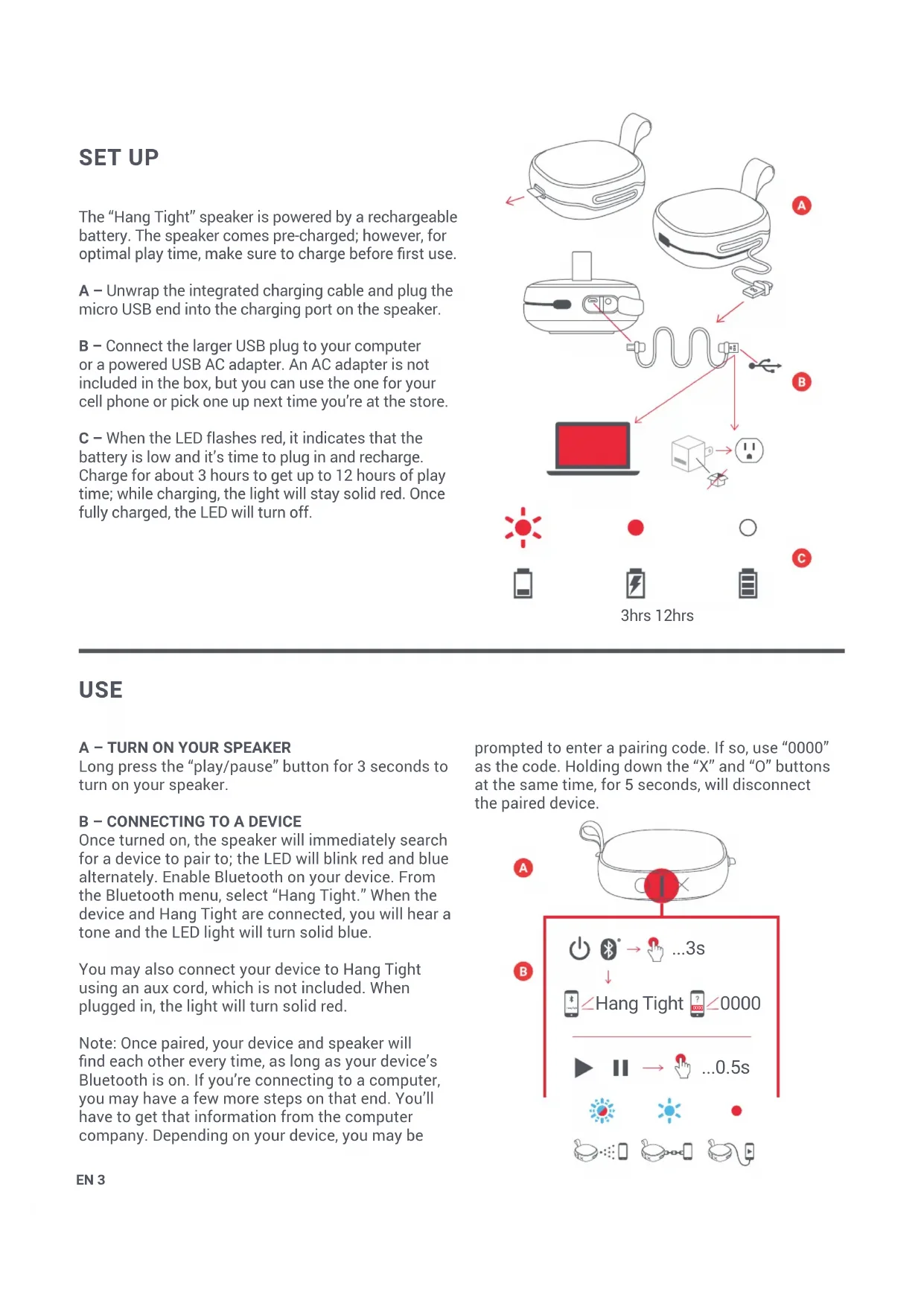 Once turned on, the speaker will immediately search for a device to pair to; the LED will blink red and blue alternately. Enable Bluetooth on your device. From the Bluetooth menu, select “Hang Tight.” When the device and Hang Tight are connected, you will hear a tone and the LED light will turn solid blue. You may also connect your device to Hang Tight using an aux cord, which is not included. When plugged in, the light will turn solid red. Note: Once paired, your device and speaker will nd each other every time, as long as your device’s Bluetooth is on. If you’re connecting to a computer, you may have a few more steps on that end. You’ll have to get that information from the computer company. Depending on your device, you may be prompted to enter a pairing code. If so, use “0000” as the code. Holding down the “X” and “O” buttons at the same time, for 5 seconds, will disconnect the paired device. 3hrs 12hrs ...3s