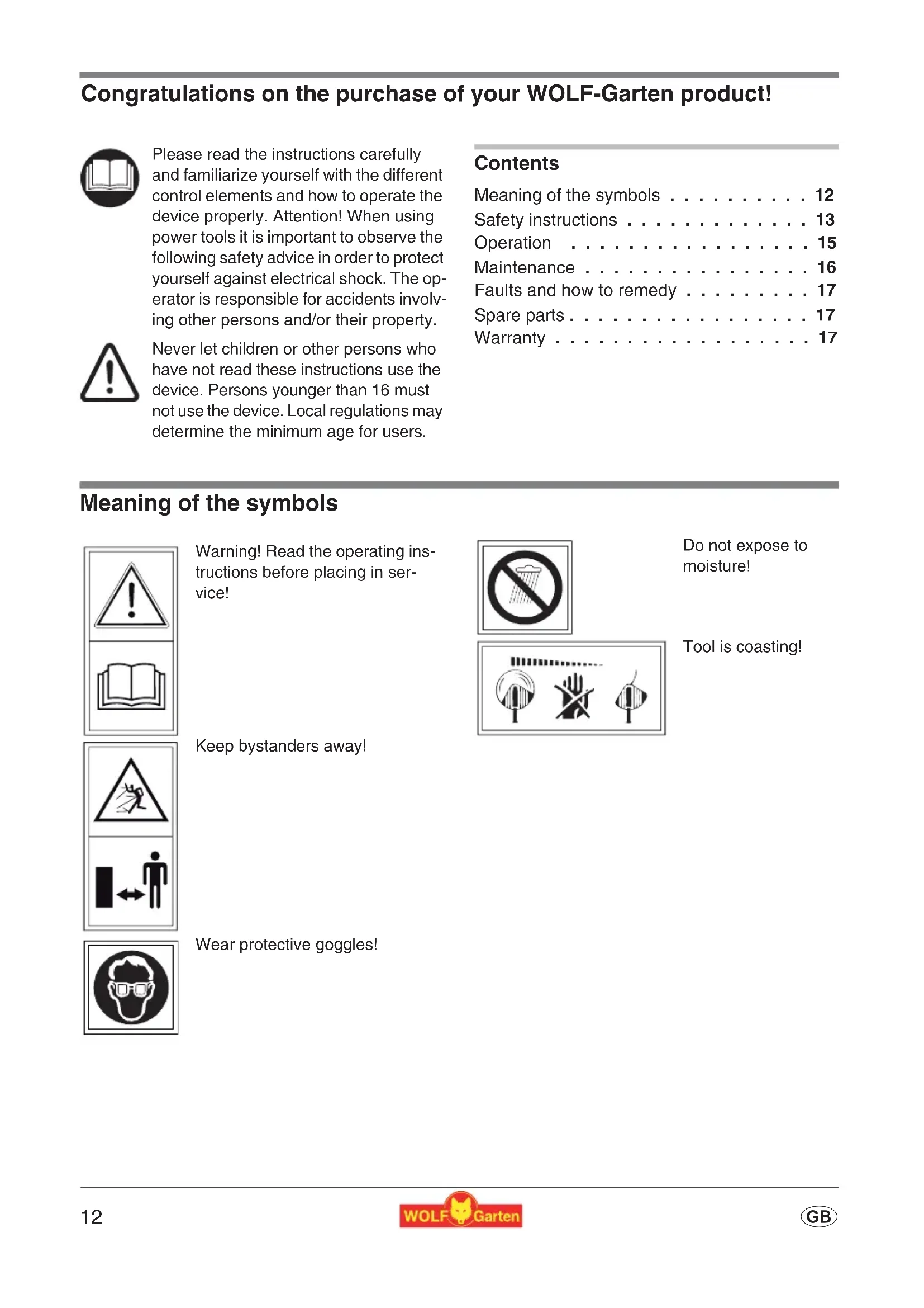 - G Congratulations on the purchase of your WOLF-Garten product! Contents Meaning of the symbols p. 12