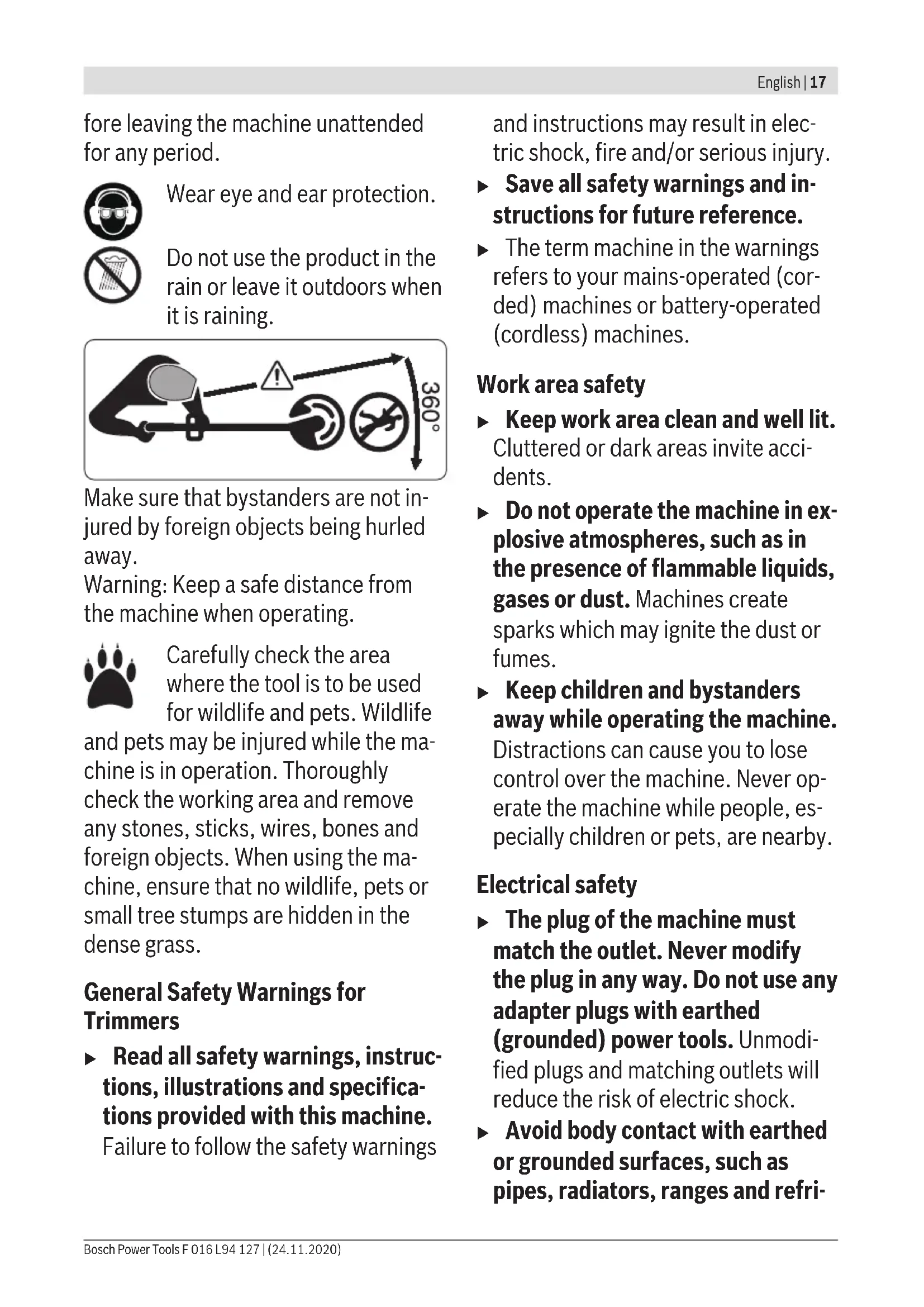 a.c. Not applicable. d.c. Remove battery before ad- justing or cleaning, and be- F 016 L94 127 | (24.11.2020) Bosch Power ToolsEnglish | 17 fore leaving the machine unattended for any period. Wear eye and ear protection. Do not use the product in the rain or leave it outdoors when it is raining. Make sure that bystanders are not in- jured by foreign objects being hurled away.