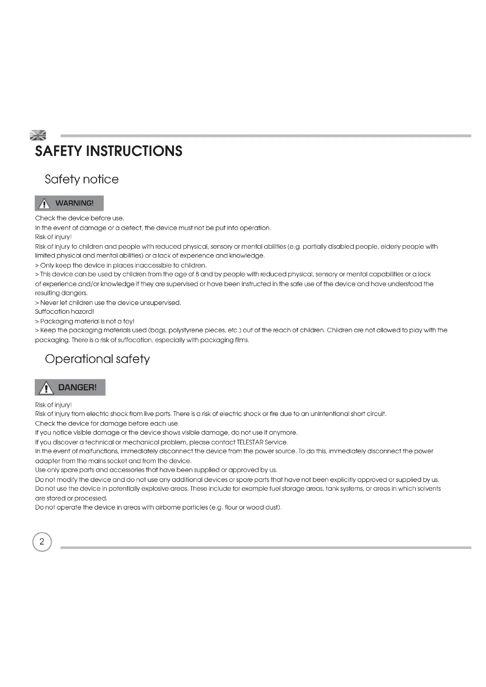 Keep the packaging materials used (bags, polystyrene pieces, etc.) out of the reach of children. Children are not allowed to play with the packaging. There is a risk of suffocation, especially with packaging films.