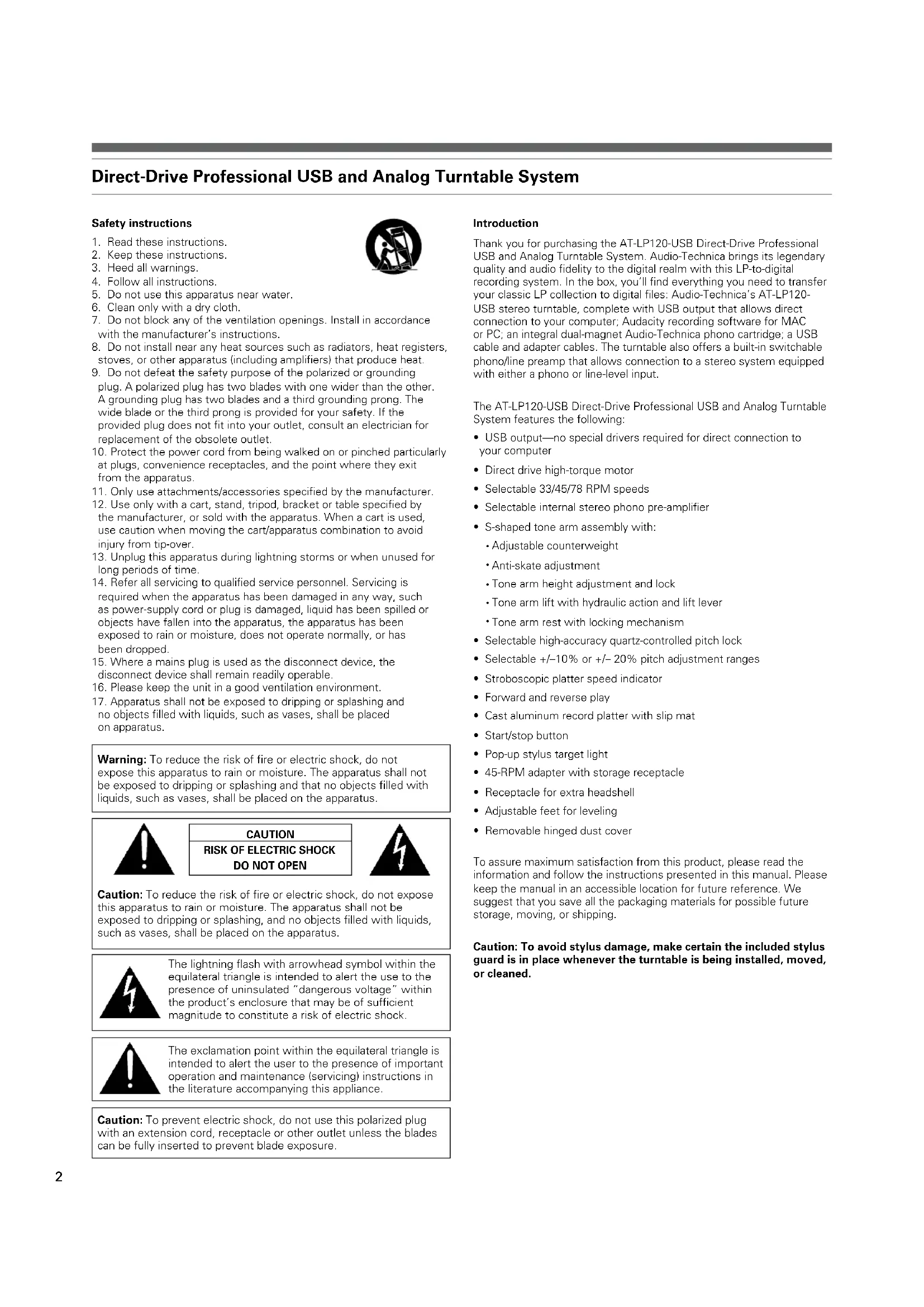 - Removable hinged dust cover To assure maximum satisfaction from this product, please read the information and follow the instructions presented in this manual. Please keep the manual in an accessible location for future reference. We suggest that you save all the packaging materials for possible future storage, moving, or shipping. Caution: To avoid stylus damage, make certain the included stylus guard is in place whenever the turntable is being installed, moved, or cleaned. Safety instructions