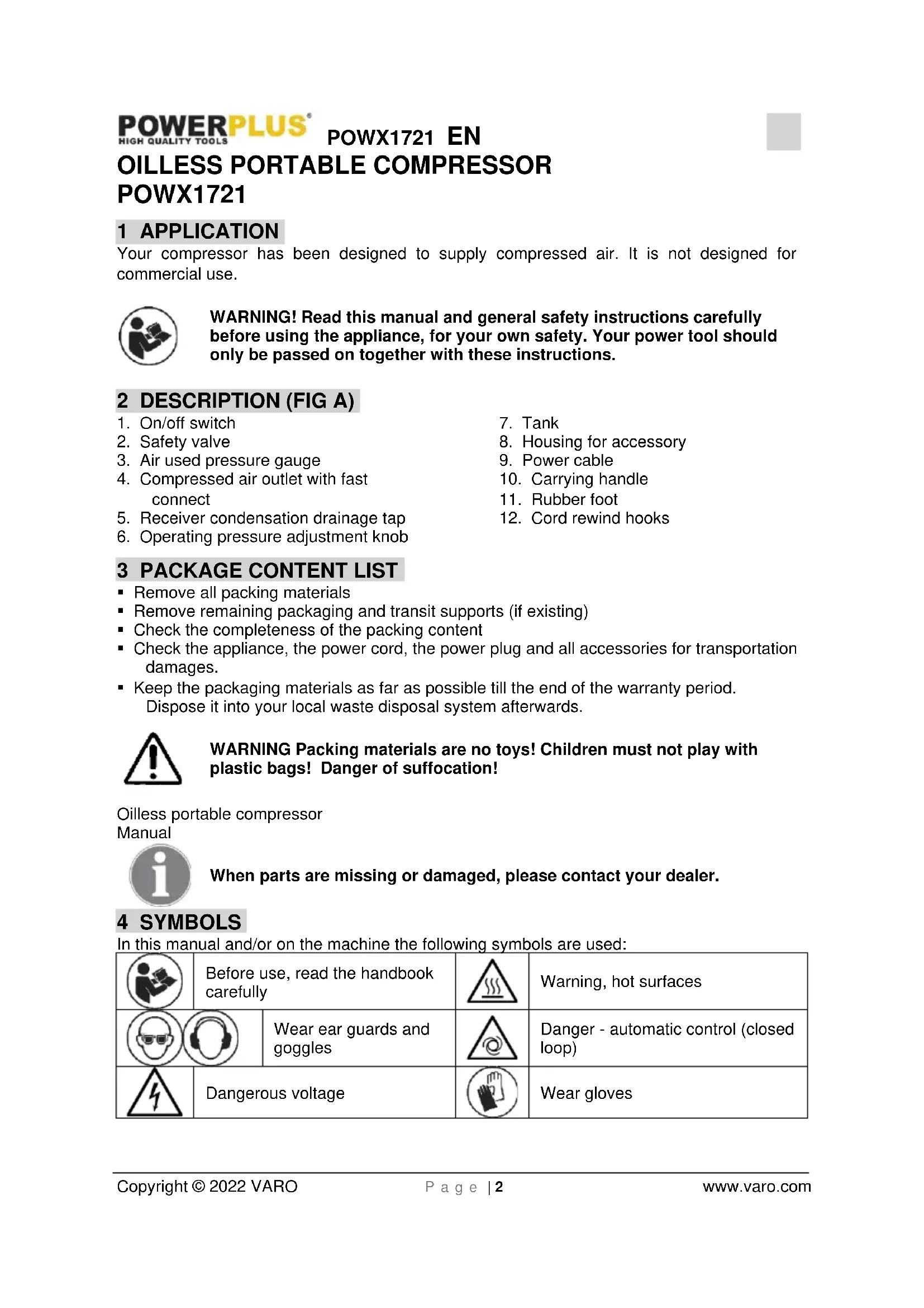 - Keep the packaging materials as far as possible till the end of the warranty period. Dispose it into your local waste disposal system afterwards. WARNING Packing materials are no toys! Children must not play with plastic bags! Danger of suffocation! Oilless portable compressor Manual When parts are missing or damaged, please contact your dealer. 4 SYMBOLS In this manual and/or on the machine the following symbols are used: