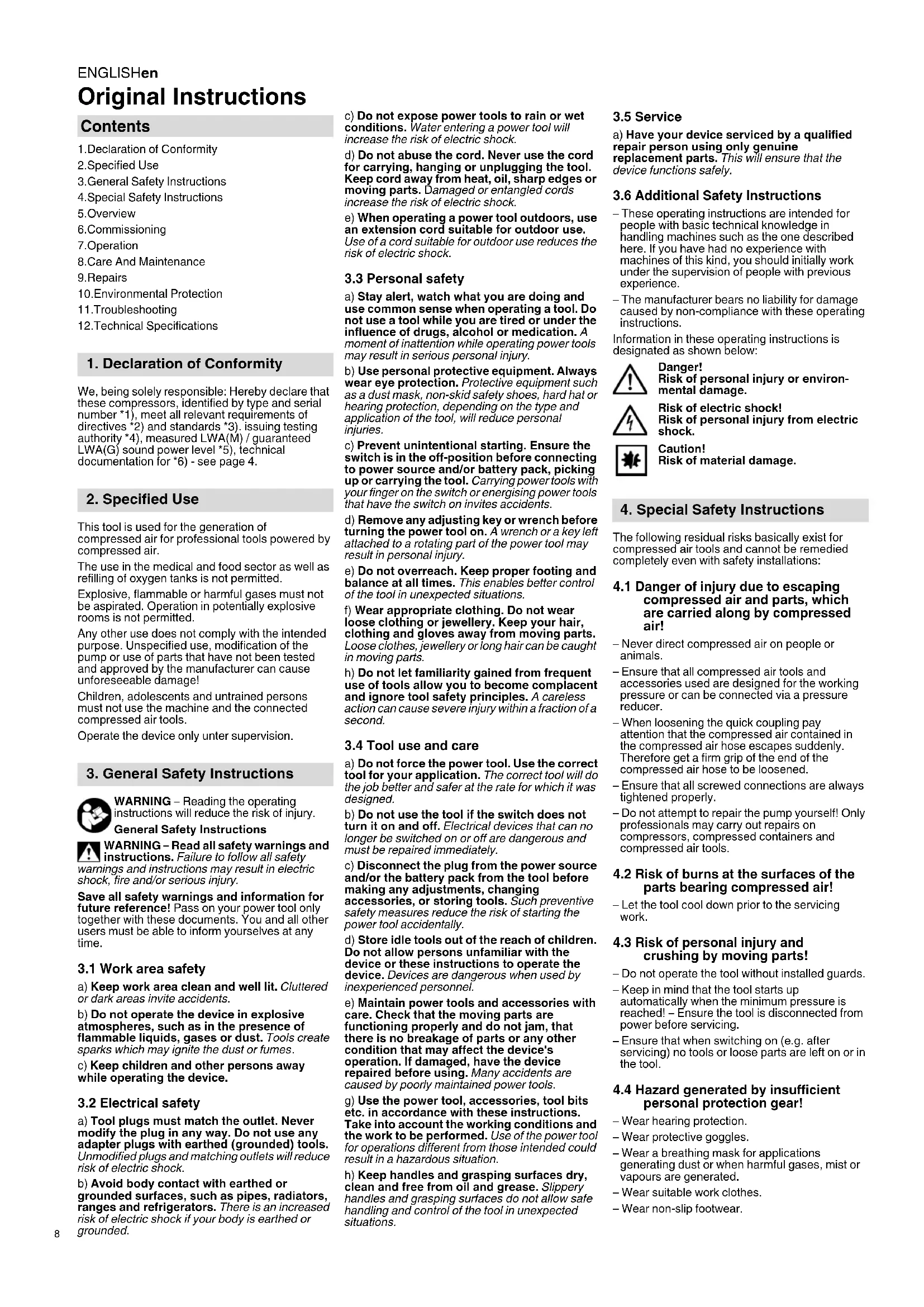 Original Instructions 1.Declaration of Conformity 2.Specified Use 3.General Safety Instructions 4.Special Safety Instructions 5.Overview 6.Commissioning 7.Operation 8.Care And Maintenance 9.Repairs 10.Environmental Protection 11.Troubleshooting 12.Technical Specifications We, being solely responsible: Hereby declare that these compressors, identified by type and serial number *1), meet all relevant requirements of directives *2) and standards *3). issuing testing authority *4), measured LWA(M) / guaranteed LWA(G) sound power level *5), technical documentation for *6) - see page 4. This tool is used for the generation of compressed air for professional tools powered by compressed air. The use in the medical and food sector as well as refilling of oxygen tanks is not permitted. Explosive, flammable or harmful gases must not be aspirated. Operation in potentially explosive rooms is not permitted. Any other use does not comply with the intended purpose. Unspecified use, modification of the pump or use of parts that have not been tested and approved by the manufacturer can cause unforeseeable damage! Children, adolescents and untrained persons must not use the machine and the connected compressed air tools. Operate the device only unter supervision. WARNING – Reading the operating instructions will reduce the risk of injury. General Safety Instructions WARNING – Read all safety warnings and instructions. Failure to follow all safety warnings and instructions may result in electric shock, fire and/or serious injury. Save all safety warnings and information for future reference! Pass on your power tool only together with these documents. You and all other users must be able to inform yourselves at any time.