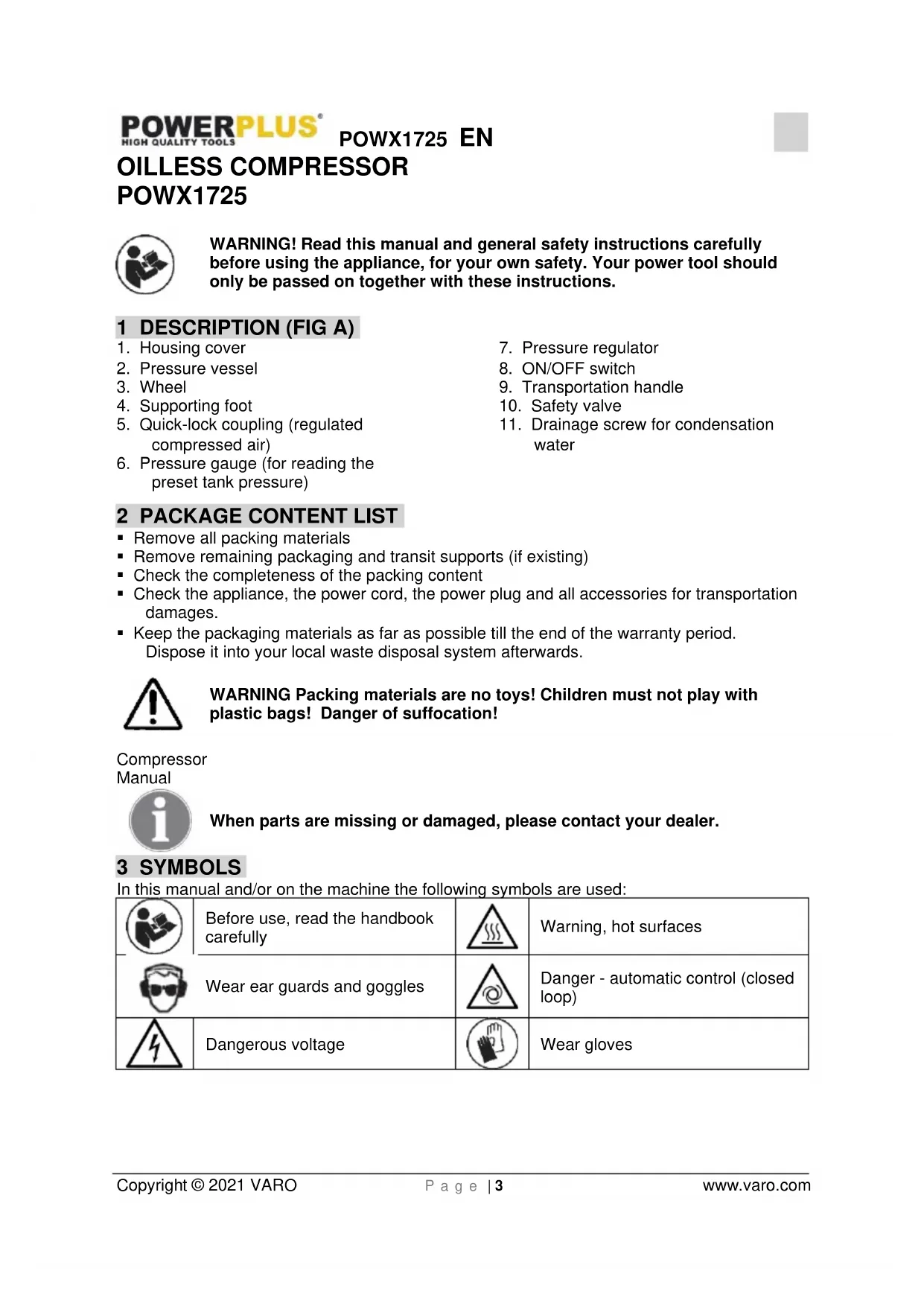 Remove all packing materials Remove remaining packaging and transit supports (if existing) Check the completeness of the packing content Check the appliance, the power cord, the power plug and all accessories for transportation damages. Keep the packaging materials as far as possible till the end of the warranty period. Dispose it into your local waste disposal system afterwards. WARNING Packing materials are no toys! Children must not play with plastic bags! Danger of suffocation! Compressor Manual When parts are missing or damaged, please contact your dealer. 3 SYMBOLS In this manual and/or on the machine the following symbols are used: