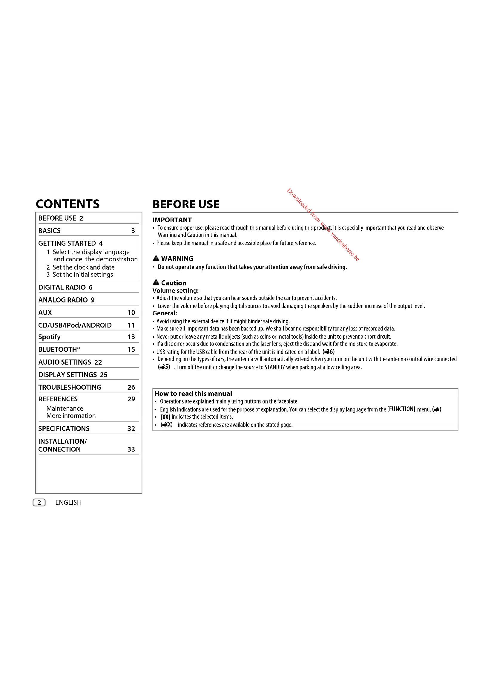 - If the volume is adjusted during reception of traffic information, announcement, alarm or news bulletin, the adjusted volume is memorized automatically. It will be applied the next time traffic information, announcement, alarm or news bulletin is turned on. JS_KWD_KDC_X7200DAB_EN_EN_4.indd 8JS_KWD_KDC_X7200DAB_EN_EN_4.indd 8 8/24/2017 8:50:23 AM8/24/2017 8:50:23 AM Downloaded from www.vandenborre.beENGLISH