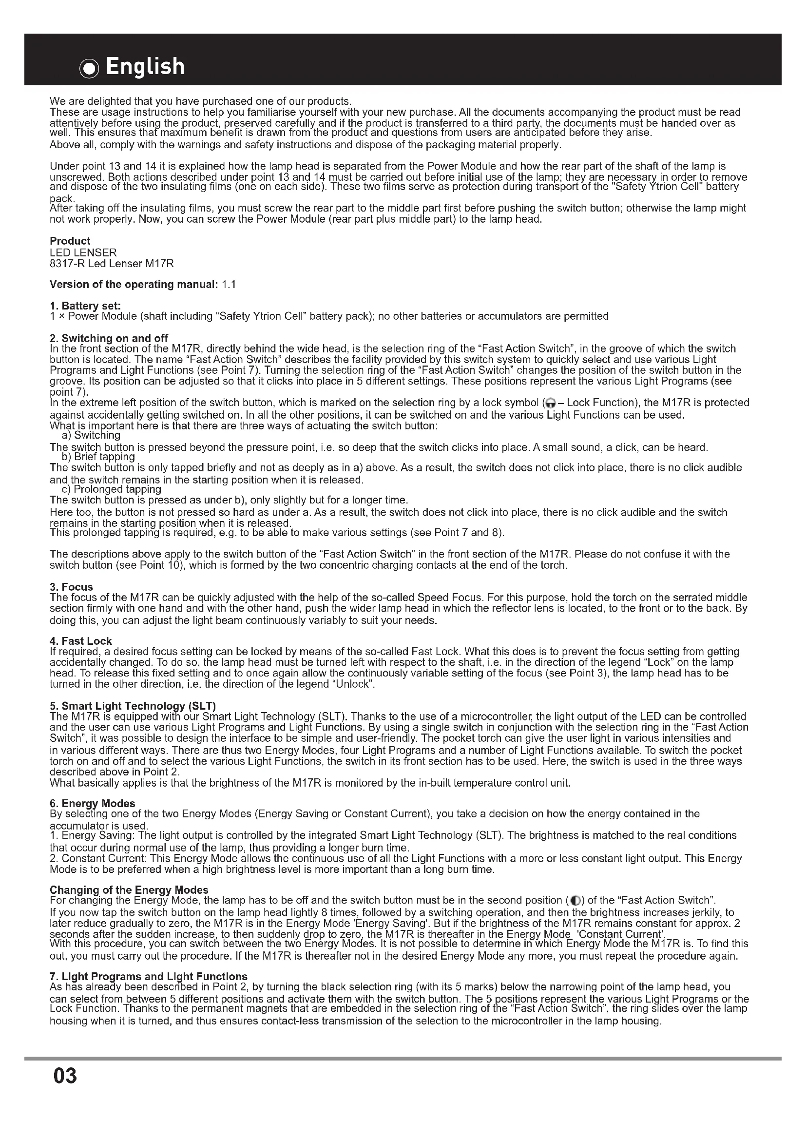For changing the Energy Mode, the lamp has to be off and the switch button must be in the second position (O) of the "Fast Action Switch". If you now tap the switch button on the lamp head lightly 8 times, followed by a switching operation, and then the brightness increases jerkily, to later reduce gradually to zero, the M17R is in the Energy Mode 'Energy Saving'. But if the brightness of the M17R remains constant for approx. 2 seconds after the sudden increase, to then suddenly drop to zero, the M17R is thereafter in the Energy Mode 'Constant Current'. With this procedure, you can switch between the two Energy Modes. It is not possible to determine in which Energy Mode the M17R is. To find this out, you must carry out the procedure. If the M17R is thereafter not in the desired Energy Mode any more, you must repeat the procedure again.