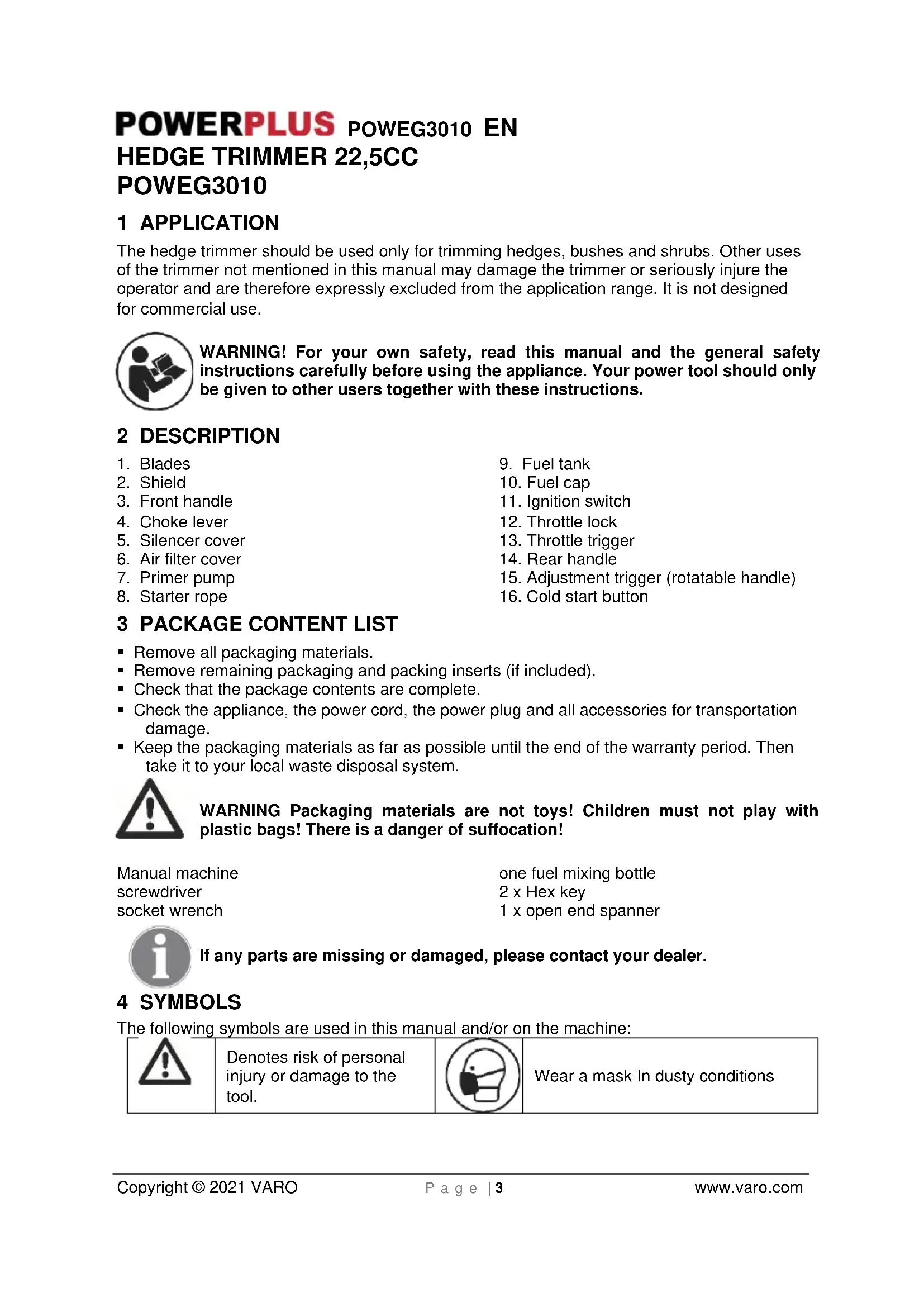 VARO – Vic. Van Rompuy N.V. - Joseph Van Instraat 9 - BE2500 Lier - BELGIUM, declares that, Product: Hedge trimmer 22,5cc Trade mark: PowerPlus Podel: POWEG3010 is in conformity with the essential requirements and other relevant provisions of the applicable European Directives, based on the application of European harmonized standards. Any unauthorized modification of the apparatus voids this declaration. European Directives (including, if applicable, their amendments up to the date of signature); 2006/42/EC 2014/30/EU 2000/14/EC Annex V LwA Measured 108dB(A) Guaranteed 110dB(A) European harmonized standards (including, if applicable, their amendments up to the date of signature); EN ISO 10517 : 2019 EN ISO 14982 : 2009 Keeper of the Technical Documentation : Philippe Vankerkhove, VARO – Vic. Van Rompuy N.V. The undersigned acts on behalf of the company CEO, Philippe Vankerkhove Regulatory Affairs – Compliance Manager 11/08/2021, Lier - BelgiumPOWEG3010 DE Copyright © 2021 VARO P a g e | 1 www.varo.com 1 EINSATZBEREICH .......................................................................... 3