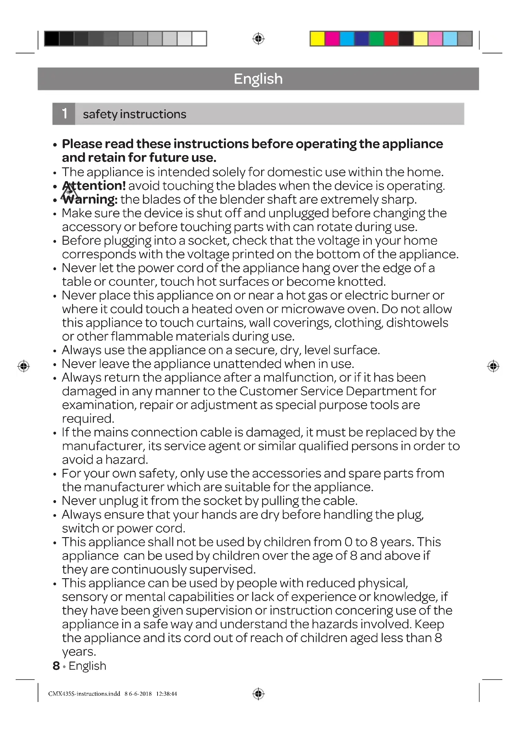 - When you have finished mixing or blending and released the button, wait until the knives have stopped turning, before approaching the blender shaft with your hands.
