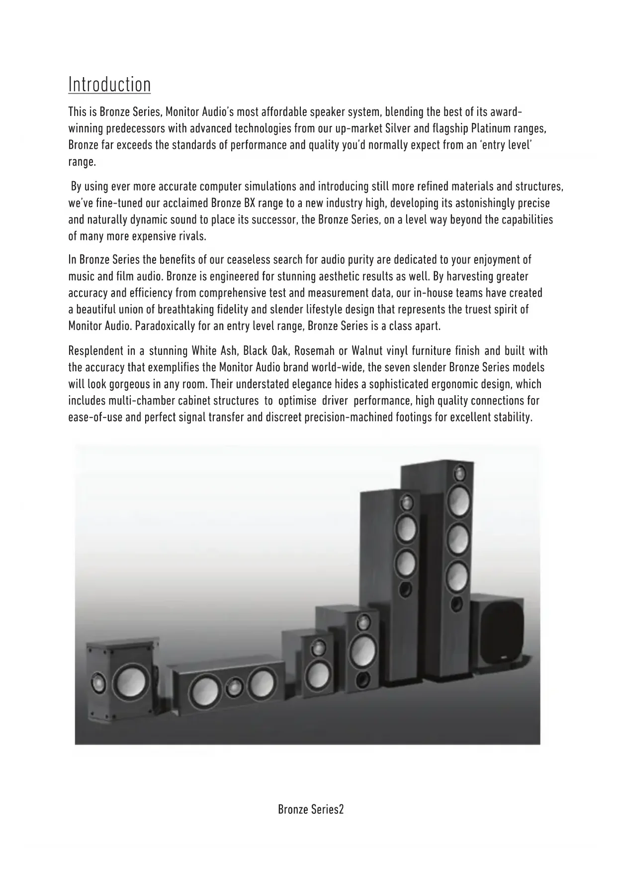 owners manual BRONZE SERIES BRONZE 1 BRONZE 2 BRONZE 5 BRONZE 6 BRONZE CENTRE BRONZE FX BRONZE W10 BRONZE SERIES BRONZE 1 BRONZE 2 BRONZE 5 BRONZE 6 BRONZE CENTRE BRONZE FX BRONZE W10monitoraudio.com 1 Contents Introduction 2 Plinth Fixing 3 Spikes and Feet 3 Setting Up 4 2 Channel Positioning 4 AV Positioning 4 Setting up the Bronze FX 5 Fixing the Bronze FX to a wall 7 Connecting Speaker Cables 7 Bare Wire Connection 7 Banana Plugs 7 Wiring 8 Single Wiring 8 Bi-Wiring 8 Bi-Amping 8 Grilles 9 Port bungs 9 Specications 10 Owner Information 11 ENGLISHBronze Series2 Introduction This is Bronze Series, Monitor Audio’s most aordable speaker system, blending the best of its award- winning predecessors with advanced technologies from our up-market Silver and agship Platinum ranges, Bronze far exceeds the standards of performance and quality you’d normally expect from an ‘entry level’ range. By using ever more accurate computer simulations and introducing still more rened materials and structures, we’ve ne-tuned our acclaimed Bronze BX range to a new industry high, developing its astonishingly precise and naturally dynamic sound to place its successor, the Bronze Series, on a level way beyond the capabilities of many more expensive rivals. In Bronze Series the benets of our ceaseless search for audio purity are dedicated to your enjoyment of music and lm audio. Bronze is engineered for stunning aesthetic results as well. By harvesting greater accuracy and eciency from comprehensive test and measurement data, our in-house teams have created a beautiful union of breathtaking delity and slender lifestyle design that represents the truest spirit of Monitor Audio. Paradoxically for an entry level range, Bronze Series is a class apart. Resplendent in a stunning White Ash, Black Oak, Rosemah or Walnut vinyl furniture nish and built with the accuracy that exemplies the Monitor Audio brand world-wide, the seven slender Bronze Series models will look gorgeous in any room. Their understated elegance hides a sophisticated ergonomic design, which includes multi-chamber cabinet structures to optimise driver performance, high quality connections for ease-of-use and perfect signal transfer and discreet precision-machined footings for excellent stability.Plinth Fixing (Bronze 5 & 6 only) The Bronze 5 & 6’s are provided with plinths to improve stability and acoustic response. The plinths are secured in place by using the supplied bolts. Before you t the plinth ensure the oor area is clear of any hard/sharp objects. To t the plinth turn the cabinet over so that the bottom is facing upwards. Place the plinth onto the cabinet and line up the bolt holes in the plinth with the inserts in the cabinet. Using the bolts, secure the plinth to the cabinet. Tighten them up gradually at rst and ensure the plinth is tted securely to the cabinet. Fit the feet/ spikes to the plinth before turning the loudspeaker back over. Spikes and Feet The oorstanders from the Bronze Series come with spikes and separate rubber feet. The spikes are to be used on carpeted oors and the rubber feet for use on hard oors where spikes are not appropriate. The spikes screw into the threaded inserts on the underside of the plinth. If you do not wish to use the plinth, spikes can be xed directly into the bottom of the cabinet. Ensure there are no trailing cables where the speakers will be sited. NOTE: When used without the plinth the stability of the cabinet will be reduced. When used on hard oor, the rubber feet simply push into the same inserts that would usually be occupied by the spikes. monitoraudio.com 3 ENGLISHBronze Series4 Setting Up 2 Channel Positioning When used in a 2 channel system, the listening position and the loudspeakers should form an equilateral triangle. The speakers should be positioned approximately 6 - 10 feet (1.8 - 3m) apart. They ideally need to be between 8 - 18 inches (20 - 45cm) away from the rear and 3 feet (~1m) from the side walls. Experimentation is strongly advised when initially setting up your speakers, as environments and personal preference dier with each installation. If there is not enough bass, for example, try moving your speakers closer to a wall. The opposite, if there is too much bass. Also see the information on page 9 refering to Port Bungs. If you are losing stereo imaging, try ‘toeing’ them in slightly. The sound should appear to originate from the centre point between the speakers, not the actual speakers themselves. AV Positioning In the following pages, there are illustrations showing optimal positioning and some suggested room layouts for AV applications. The front, and in some cases rear, oor standing and stand mount speakers should be positioned approx 6 - 9 feet apart (1.8m - 2.5m) and start with them about 10 inches (25cm) from the wall. If the sound is too bass heavy or there is bass boom from the room when playing music (without a subwoofer), try moving the loudspeakers slightly further away from the wall(s) or adjusting the crossover frequency settings for the speakers and/ or sub. Also try changing the sub’s position. If this is not possible, then try the supplied port bungs (not included in the Bronze-FX or Centre). Refer to Page 9. The Bronze Centre should be positioned so that it is pointing at the viewing position and at approximate ear height. If it is below or above ear height, use some rubber feet (small feet supplied) to angle it slightly. The Bronze FX’s should be positioned in accordance with the below illustrations and instructions, and approx 2 feet (60cm) to the bottom of the speaker above ear height when in your listening position. NOTE: When using 2 pairs of Bronze FX in a 7.1 system, you need to use the RIGHT hand speaker for the rear surround right and the LEFT hand speaker for the rear surround left. Your side surround speakers will then be set with the RIGHT speaker on the left wall and LEFT speaker on the right wall. This is because of the tweeter ph