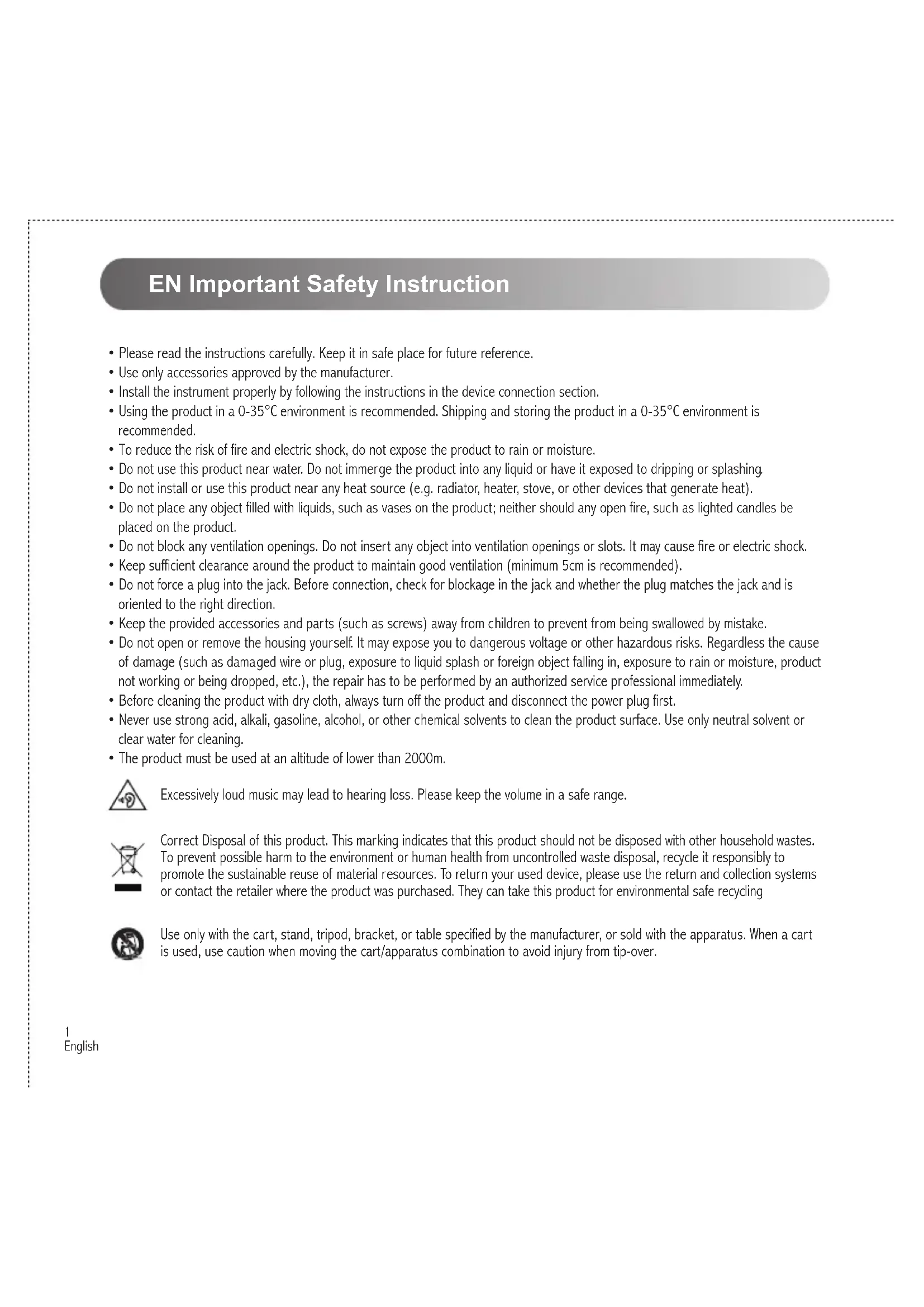 - Do not place any object filled with liquids, such as vases on the product; neither should any open fire, such as lighted candles be placed on the product.