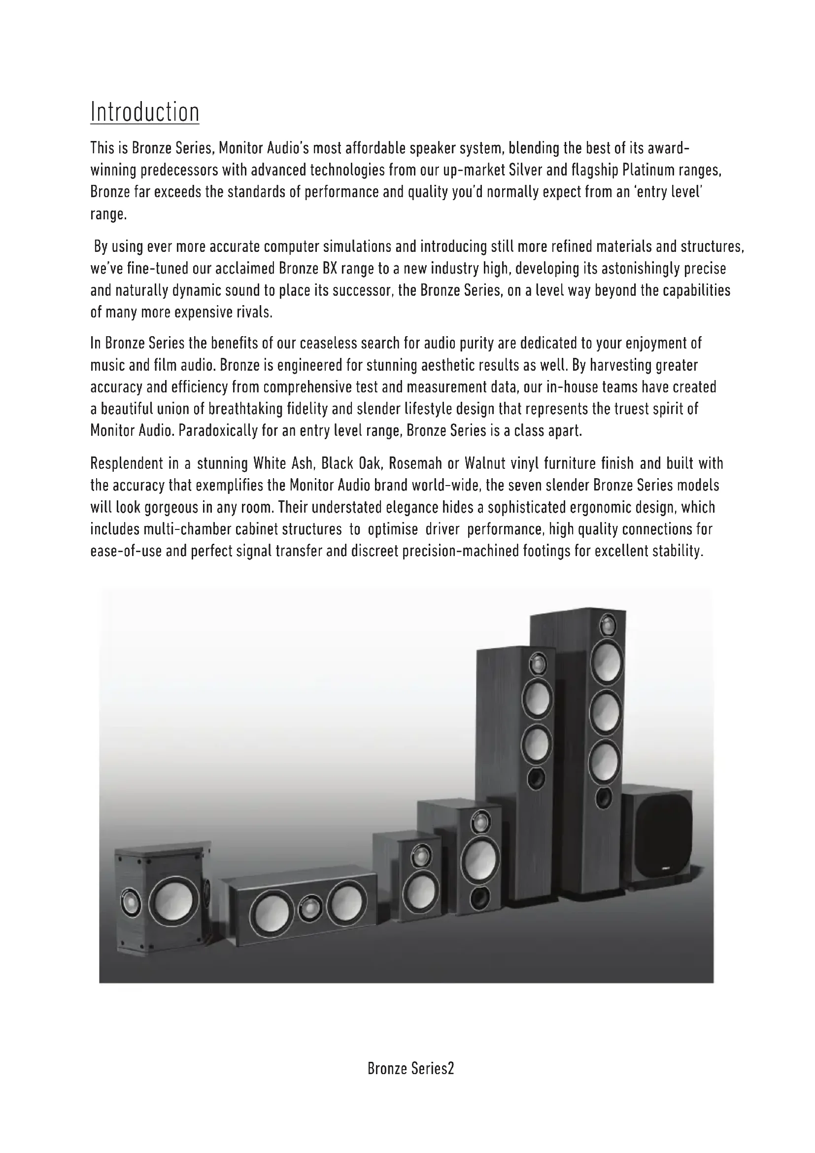 owners manual BRONZE SERIES BRONZE 1 BRONZE 2 BRONZE 5 BRONZE 6 BRONZE CENTRE BRONZE FX BRONZE W10 BRONZE SERIES BRONZE 1 BRONZE 2 BRONZE 5 BRONZE 6 BRONZE CENTRE BRONZE FX BRONZE W10monitoraudio.com 1 Contents Introduction 2 Plinth Fixing 3 Spikes and Feet 3 Setting Up 4 2 Channel Positioning 4 AV Positioning 4 Setting up the Bronze FX 5 Fixing the Bronze FX to a wall 7 Connecting Speaker Cables 7 Bare Wire Connection 7 Banana Plugs 7 Wiring 8 Single Wiring 8 Bi-Wiring 8 Bi-Amping 8 Grilles 9 Port bungs 9 Specications 10 Owner Information 11 ENGLISHBronze Series2 Introduction This is Bronze Series, Monitor Audio’s most aordable speaker system, blending the best of its award- winning predecessors with advanced technologies from our up-market Silver and agship Platinum ranges, Bronze far exceeds the standards of performance and quality you’d normally expect from an ‘entry level’ range. By using ever more accurate computer simulations and introducing still more rened materials and structures, we’ve ne-tuned our acclaimed Bronze BX range to a new industry high, developing its astonishingly precise and naturally dynamic sound to place its successor, the Bronze Series, on a level way beyond the capabilities of many more expensive rivals. In Bronze Series the benets of our ceaseless search for audio purity are dedicated to your enjoyment of music and lm audio. Bronze is engineered for stunning aesthetic results as well. By harvesting greater accuracy and eciency from comprehensive test and measurement data, our in-house teams have created a beautiful union of breathtaking delity and slender lifestyle design that represents the truest spirit of Monitor Audio. Paradoxically for an entry level range, Bronze Series is a class apart. Resplendent in a stunning White Ash, Black Oak, Rosemah or Walnut vinyl furniture nish and built with the accuracy that exemplies the Monitor Audio brand world-wide, the seven slender Bronze Series models will look gorgeous in any room. Their understated elegance hides a sophisticated ergonomic design, which includes multi-chamber cabinet structures to optimise driver performance, high quality connections for ease-of-use and perfect signal transfer and discreet precision-machined footings for excellent stability.Plinth Fixing (Bronze 5 & 6 only) The Bronze 5 & 6’s are provided with plinths to improve stability and acoustic response. The plinths are secured in place by using the supplied bolts. Before you t the plinth ensure the oor area is clear of any hard/sharp objects. To t the plinth turn the cabinet over so that the bottom is facing upwards. Place the plinth onto the cabinet and line up the bolt holes in the plinth with the inserts in the cabinet. Using the bolts, secure the plinth to the cabinet. Tighten them up gradually at rst and ensure the plinth is tted securely to the cabinet. Fit the feet/ spikes to the plinth before turning the loudspeaker back over. Spikes and Feet The oorstanders from the Bronze Series come with spikes and separate rubber feet. The spikes are to be used on carpeted oors and the rubber feet for use on hard oors where spikes are not appropriate. The spikes screw into the threaded inserts on the underside of the plinth. If you do not wish to use the plinth, spikes can be xed directly into the bottom of the cabinet. Ensure there are no trailing cables where the speakers will be sited. NOTE: When used without the plinth the stability of the cabinet will be reduced. When used on hard oor, the rubber feet simply push into the same inserts that would usually be occupied by the spikes. monitoraudio.com 3 ENGLISHBronze Series4 Setting Up 2 Channel Positioning When used in a 2 channel system, the listening position and the loudspeakers should form an equilateral triangle. The speakers should be positioned approximately 6 - 10 feet (1.8 - 3m) apart. They ideally need to be between 8 - 18 inches (20 - 45cm) away from the rear and 3 feet (~1m) from the side walls. Experimentation is strongly advised when initially setting up your speakers, as environments and personal preference dier with each installation. If there is not enough bass, for example, try moving your speakers closer to a wall. The opposite, if there is too much bass. Also see the information on page 9 refering to Port Bungs. If you are losing stereo imaging, try ‘toeing’ them in slightly. The sound should appear to originate from the centre point between the speakers, not the actual speakers themselves. AV Positioning In the following pages, there are illustrations showing optimal positioning and some suggested room layouts for AV applications. The front, and in some cases rear, oor standing and stand mount speakers should be positioned approx 6 - 9 feet apart (1.8m - 2.5m) and start with them about 10 inches (25cm) from the wall. If the sound is too bass heavy or there is bass boom from the room when playing music (without a subwoofer), try moving the loudspeakers slightly further away from the wall(s) or adjusting the crossover frequency settings for the speakers and/ or sub. Also try changing the sub’s position. If this is not possible, then try the supplied port bungs (not included in the Bronze-FX or Centre). Refer to Page 9. The Bronze Centre should be positioned so that it is pointing at the viewing position and at approximate ear height. If it is below or above ear height, use some rubber feet (small feet supplied) to angle it slightly. The Bronze FX’s should be positioned in accordance with the below illustrations and instructions, and approx 2 feet (60cm) to the bottom of the speaker above ear height when in your listening position. NOTE: When using 2 pairs of Bronze FX in a 7.1 system, you need to use the RIGHT hand speaker for the rear surround right and the LEFT hand speaker for the rear surround left. Your side surround speakers will then be set with the RIGHT speaker on the left wall and LEFT speaker on the right wall. This is because of the tweeter ph