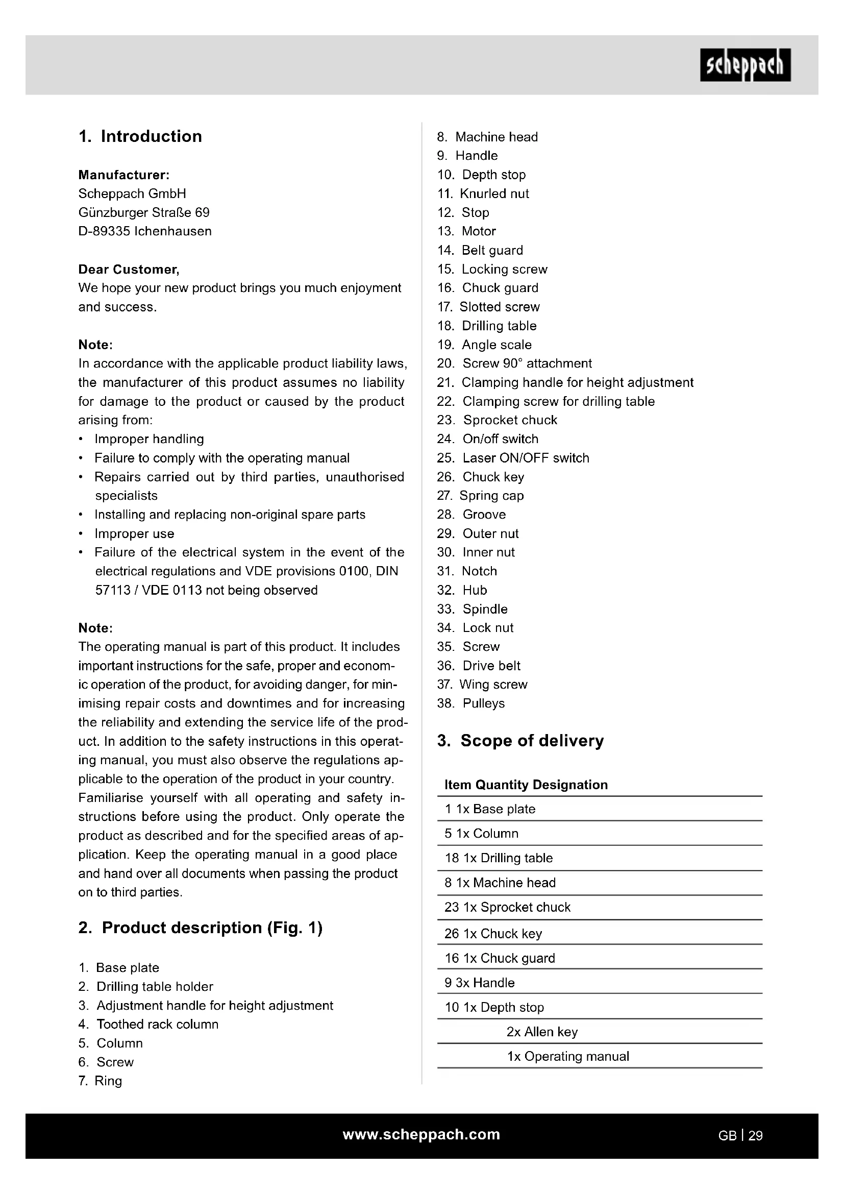 Manufacturer: Scheppach GmbH Günzburger Straße 69 D-89335 Ichenhausen Dear Customer, We hope your new product brings you much enjoyment and success. Note: In accordance with the applicable product liability laws, the manufacturer of this product assumes no liability for damage to the product or caused by the product arising from: