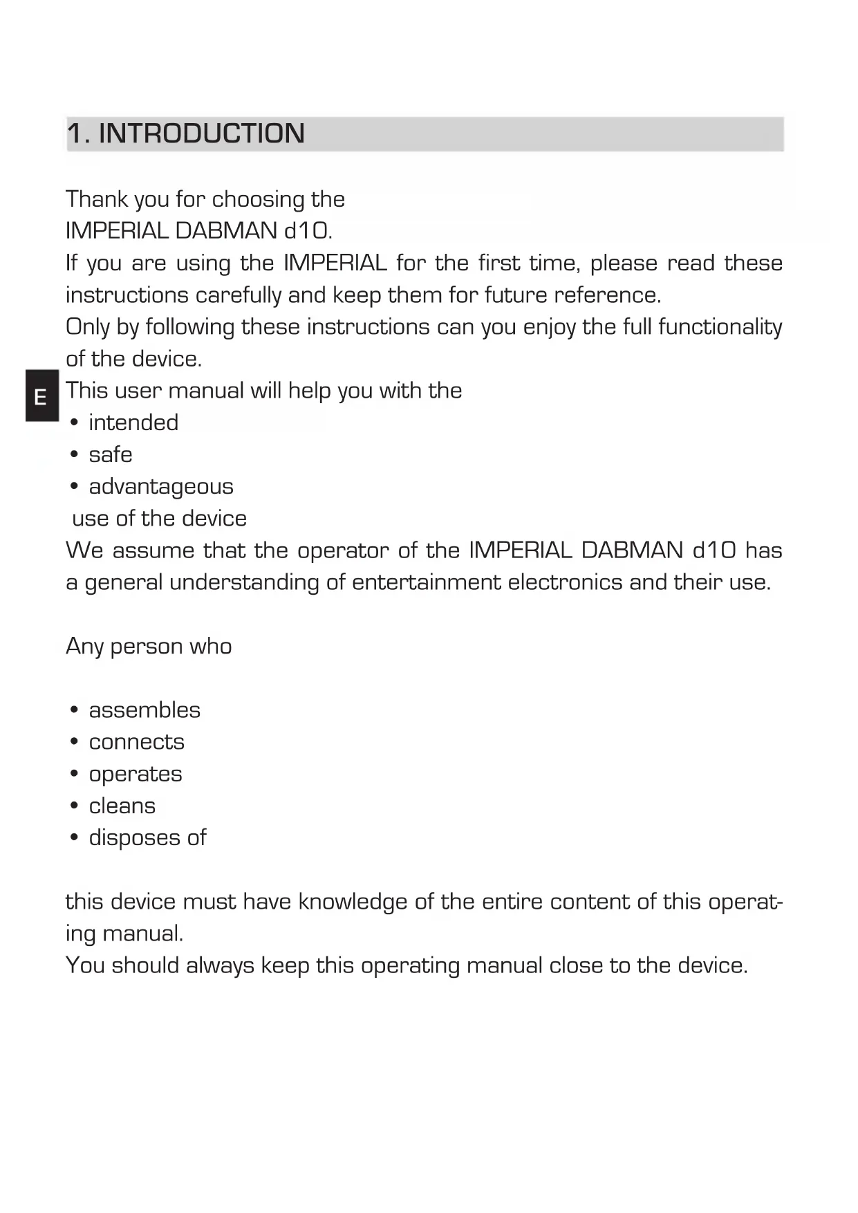 We assume that the operator of the IMPERIAL DABMAN d10 has a general understanding of entertainment electronics and their use.
