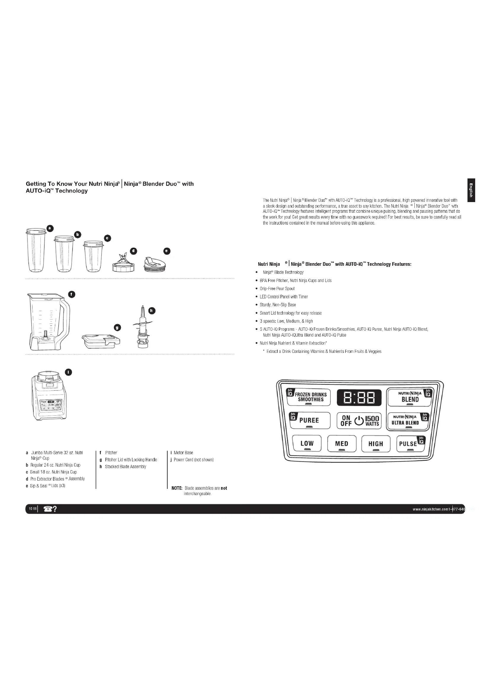 Technology features intelligent programs that combine unique pulsing, blending and pausing patterns that do the work for you! Get great results every time with no guesswork required! For best results, be sure to carefully read all the instructions contained in the manual before using this appliance. NOTE: Blade assemblies are not interchangeable.English