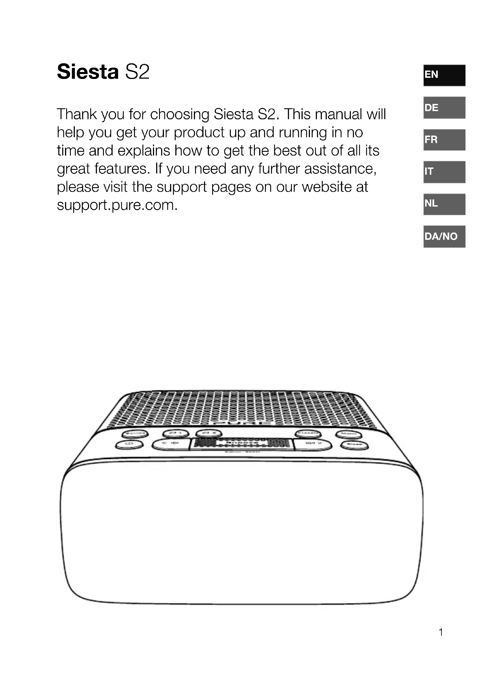 Siesta S2 Thank you for choosing Siesta S2. This manual will help you get your product up and running in no time and explains how to get the best out of all its great features. If you need any further assistance, please visit the support pages on our website at support.pure.com.2 Note: For information on all the other symbols used on the product, download the Siesta S2 user guide from support.pure.com.