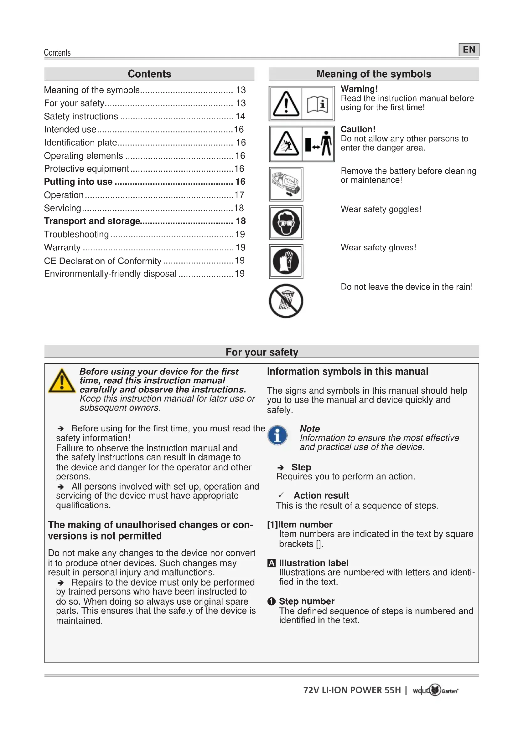 Download the instructions for your Hedge trimmers in PDF format for free! Find your manual 72V LiIon Accu Power 55H - Wolf Garten and take your electronic device back in hand. On this page are published all the documents necessary for the use of your device. 72V LiIon Accu Power 55H by Wolf Garten.