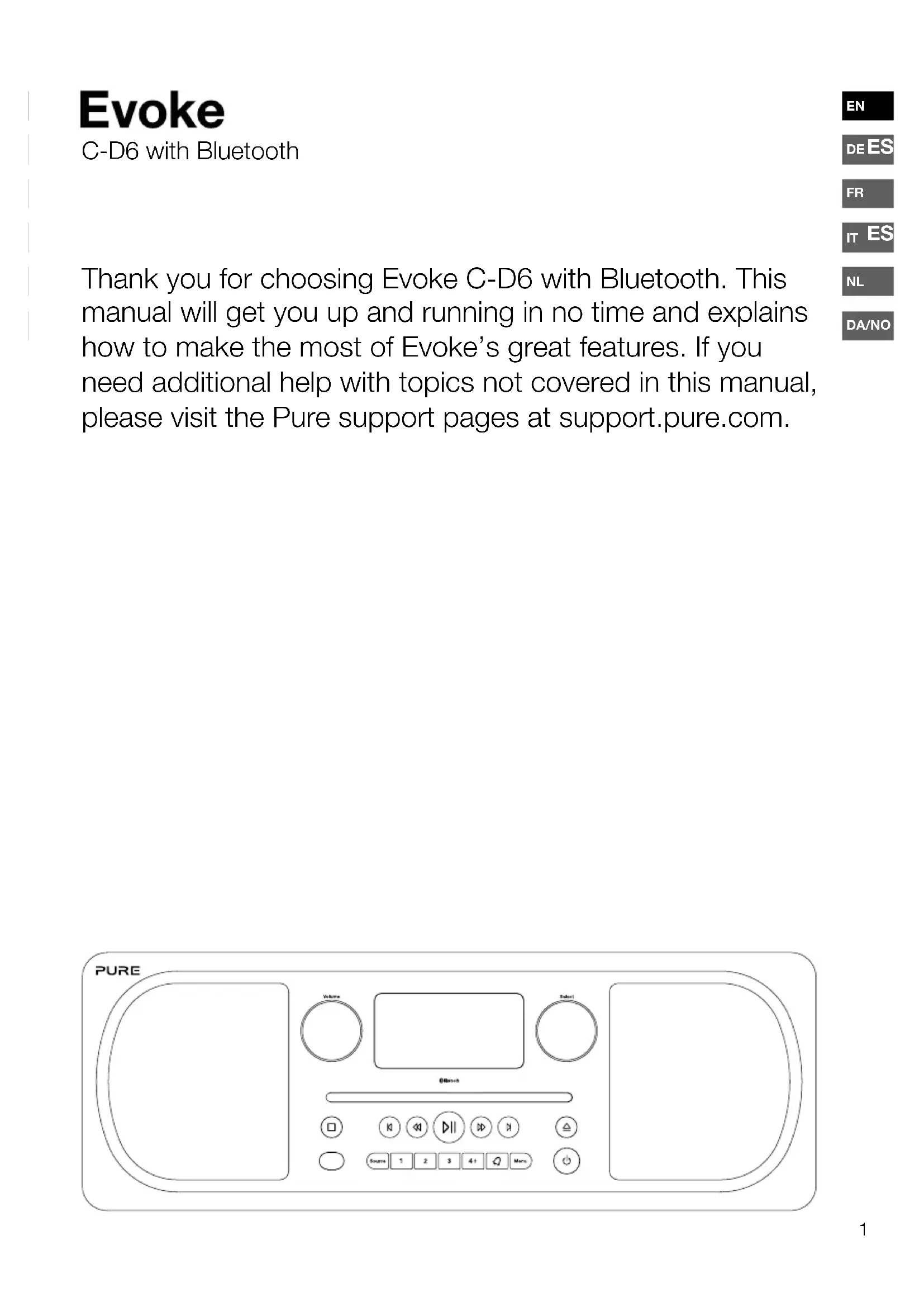 Thank you for choosing Evoke C-D6 with Bluetooth. This manual will get you up and running in no time and explains how to make the most of Evoke’s great features. If you need additional help with topics not covered in this manual, please visit the Pure support pages at support.pure.com. C-D6 with Bluetooth2 Safety instructions