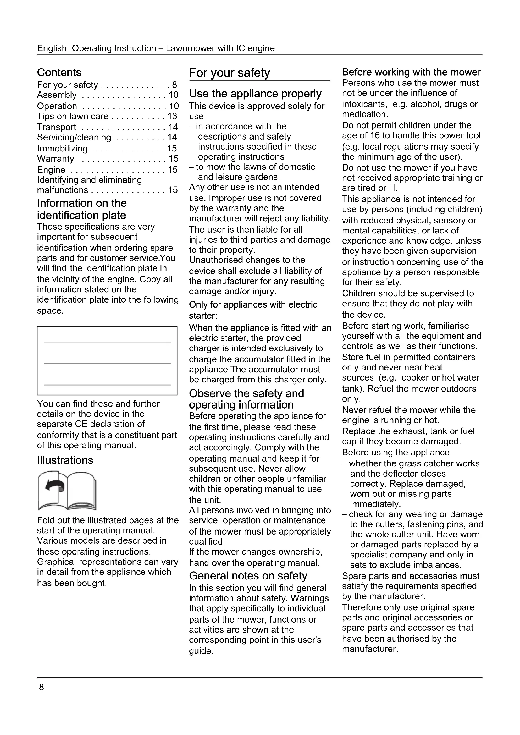 detail from the appliance which has been bought. For your safety Use the appliance properly This device is approved solely for use – in accordance with the descriptions and safety instructions specified in these operating instructions – to mow the lawns of domestic and leisure gardens. Any other use is not an intended use. Improper use is not covered by the warranty and the manufacturer will reject any liability. The user is then liable for all injuries to third parties and damage to their property. Unauthorised changes to the device shall exclude all liability of the manufacturer for any resulting damage and/or injury. Only for appliances with electric starter: When the appliance is fitted with an electric starter, the provided charger is intended exclusively to charge the accumulator fitted in the appliance The accumulator must be charged from this charger only. Observe the safety and operating information Before operating the appliance for the first time, please read these operating instructions carefully and act accordingly. Comply with the operating manual and keep it for subsequent use. Never allow children or other people unfamiliar with this operating manual to use the unit. All persons involved in bringing into service, operation or maintenance of the mower must be appropriately qualified. If the mower changes ownership, hand over the operating manual. General notes on safety In this section you will find general information about safety. Warnings that apply specifically to individual parts of the mower, functions or activities are shown at the corresponding point in this user's guide. Before working with the mower Persons who use the mower must not be under the influence of intoxicants, e.g. alcohol, drugs or medication. Do not permit children under the age of 16 to handle this power tool (e.g. local regulations may specify the minimum age of the user). Do not use the mower if you have not received appropriate training or are tired or ill. This appliance is not intended for use by persons (including children) with reduced physical, sensory or mental capabilities, or lack of experience and knowledge, unless they have been given supervision or instruction concerning use of the appliance by a person responsible for their safety. Children should be supervised to ensure that they do not play with the device. Before starting work, familiarise yourself with all the equipment and controls as well as their functions. Store fuel in permitted containers only and never near heat sources (e.g. cooker or hot water tank). Refuel the mower outdoors only. Never refuel the mower while the engine is running or hot. Replace the exhaust, tank or fuel cap if they become damaged. Before using the appliance, – whether the grass catcher works and the deflector closes correctly. Replace damaged, worn out or missing parts immediately. – check for any wearing or damage to the cutters, fastening pins, and the whole cutter unit. Have worn or damaged parts replaced by a specialist company and only in sets to exclude imbalances. Spare parts and accessories must satisfy the requirements specified by the manufacturer. Therefore only use original spare parts and original accessories or spare parts and accessories that have been authorised by the manufacturer.Operating Instruction – Lawnmower with IC engine English