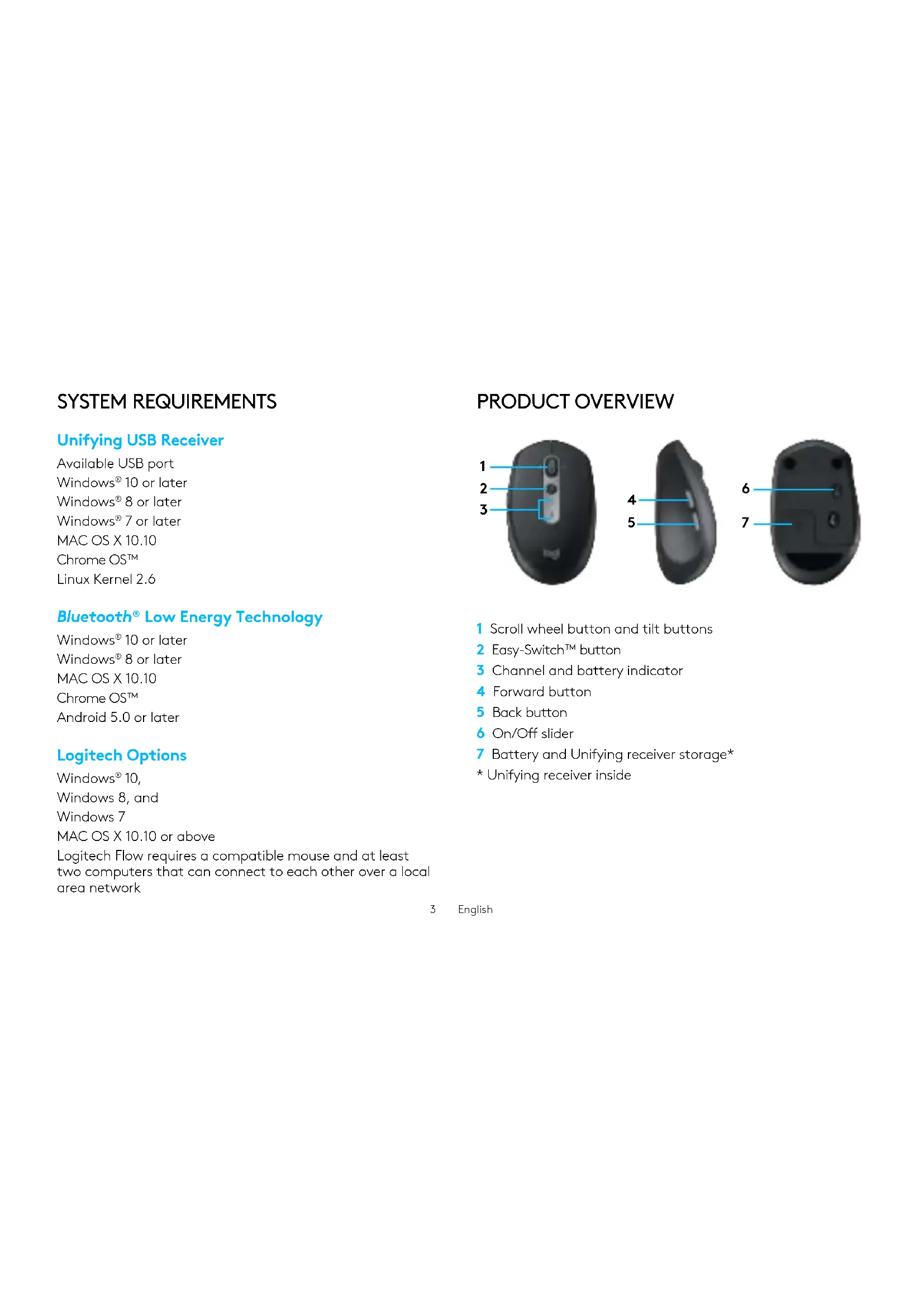 10, Windows 8, and Windows 7 MAC OS X 10.10 or above Logitech Flow requires a compatible mouse and at least two computers that can connect to each other over a local area network PRODUCT OVERVIEW 1 Scroll wheel button and tilt buttons 2 Easy-Switch™ button 3 Channel and battery indicator 4 Forward button 5 Back button 6 On/O slider 7 Battery and Unifying receiver storage*