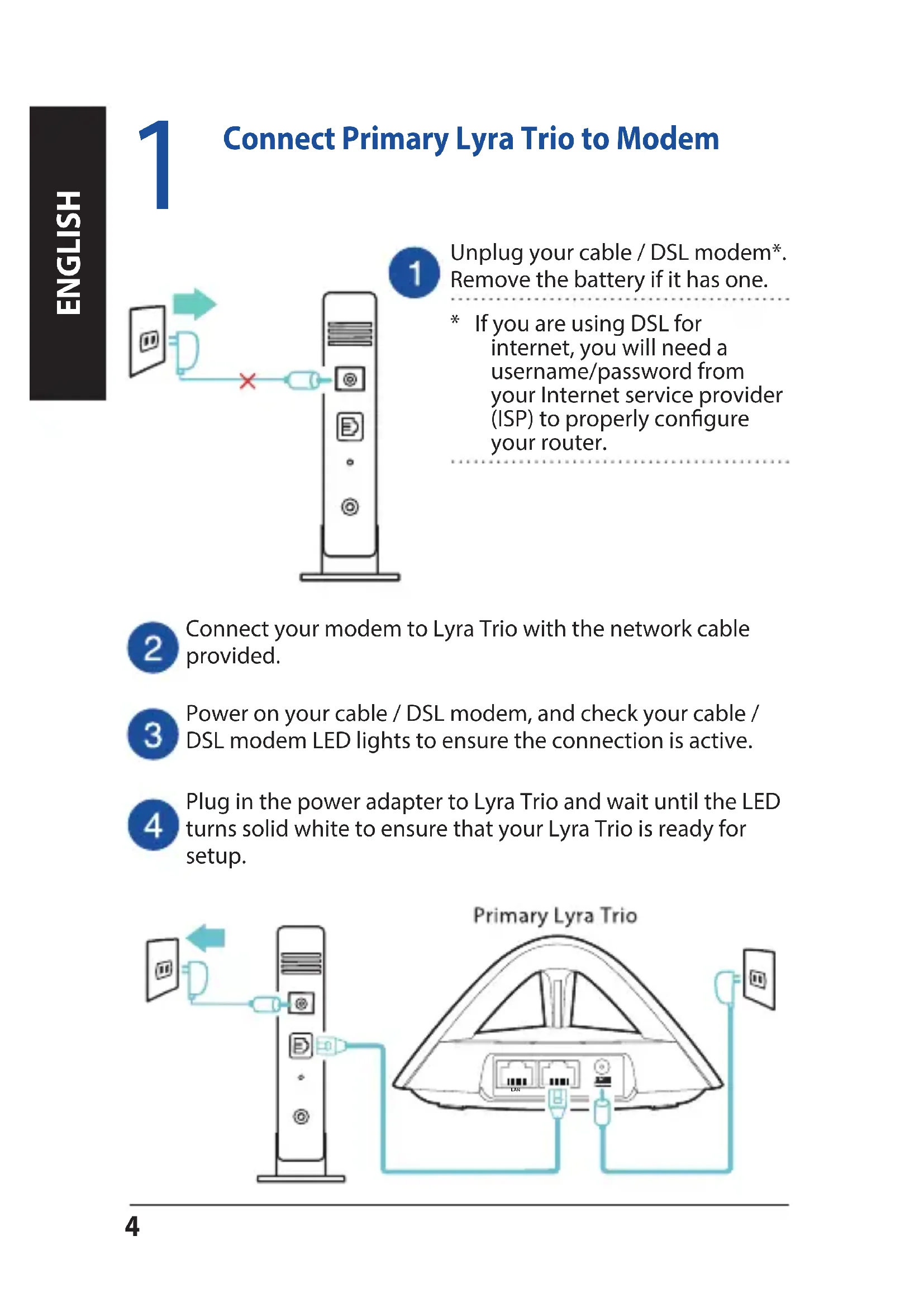Connect your modem to Lyra Trio with the network cable provided Unplug your cable / DSL modem* Remove the battery if it has one