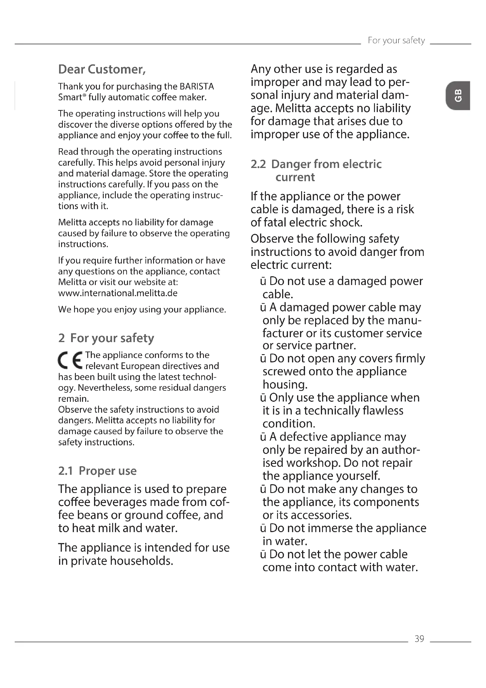 Dear Customer, Thank you for purchasing the BARISTA Smart® fully automatic coee maker. The operating instructions will help you discover the diverse options oered by the appliance and enjoy your coee to the full. Read through the operating instructions carefully. This helps avoid personal injury and material damage. Store the operating instructions carefully. If you pass on the appliance, include the operating instruc- tions with it. Melitta accepts no liability for damage caused by failure to observe the operating instructions. If you require further information or have any questions on the appliance, contact Melitta or visit our website at: www.international.melitta.de We hope you enjoy using your appliance. 2 For your safety The appliance conforms to the relevant European directives and has been built using the latest technol- ogy. Nevertheless, some residual dangers remain. Observe the safety instructions to avoid dangers. Melitta accepts no liability for damage caused by failure to observe the safety instructions.