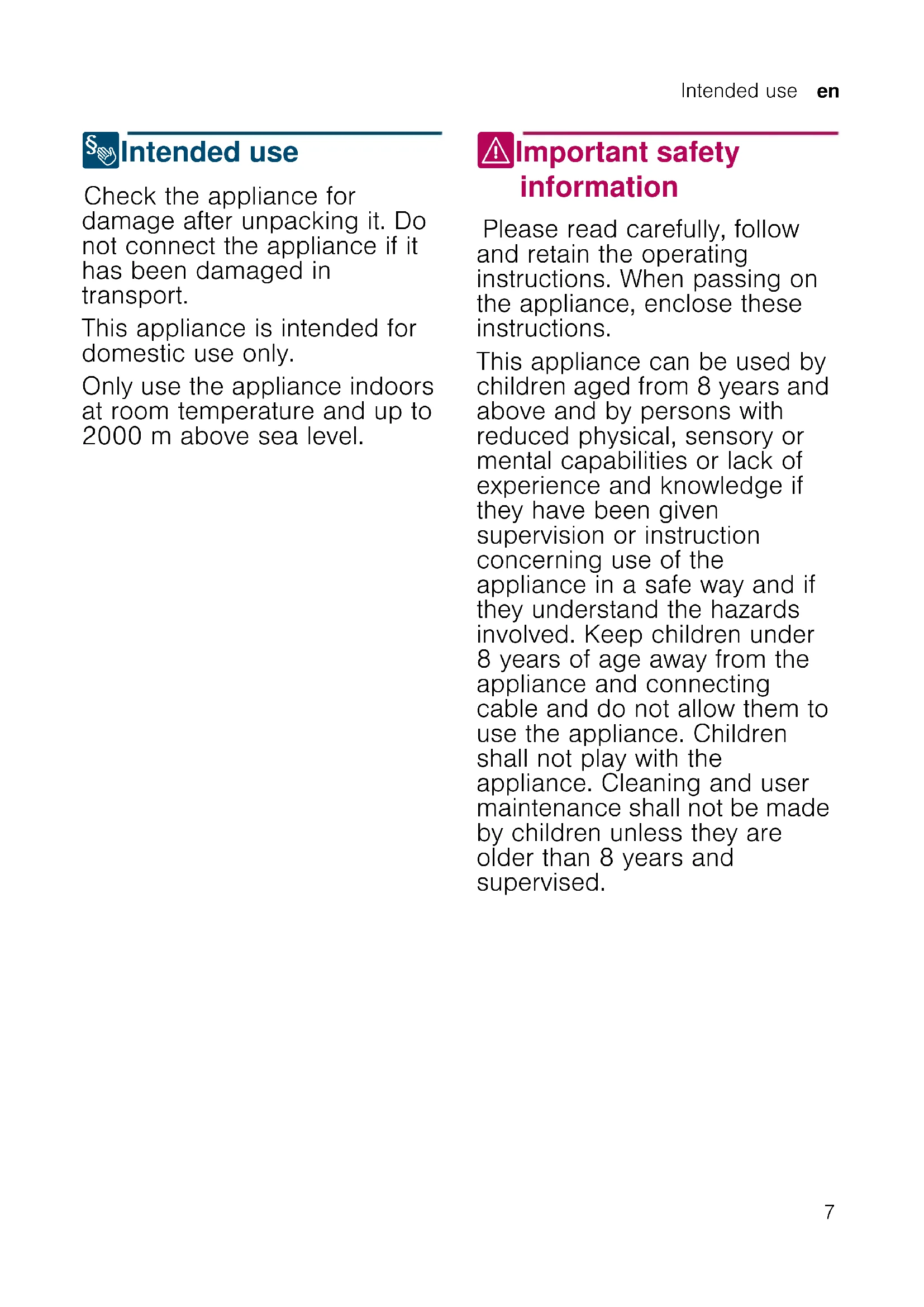 8 Intended use I nt ended use Check the appliance for damage after unpacking it. Do not connect the appliance if it has been damaged in transport. This appliance is intended for domestic use only. Only use the appliance indoors at room temperature and up to 2000 m above sea level. ( Important safety information Impor t ant saf et y informat i on Please read carefully, follow and retain the operating instructions. When passing on the appliance, enclose these instructions. This appliance can be used by children aged from 8 years and above and by persons with reduced physical, sensory or mental capabilities or lack of experience and knowledge if they have been given supervision or instruction concerning use of the appliance in a safe way and if they understand the hazards involved. Keep children under 8 years of age away from the appliance and connecting cable and do not allow them to use the appliance. Children shall not play with the appliance. Cleaning and user maintenance shall not be made by children unless they are older than 8 years and supervised.en Important safety information