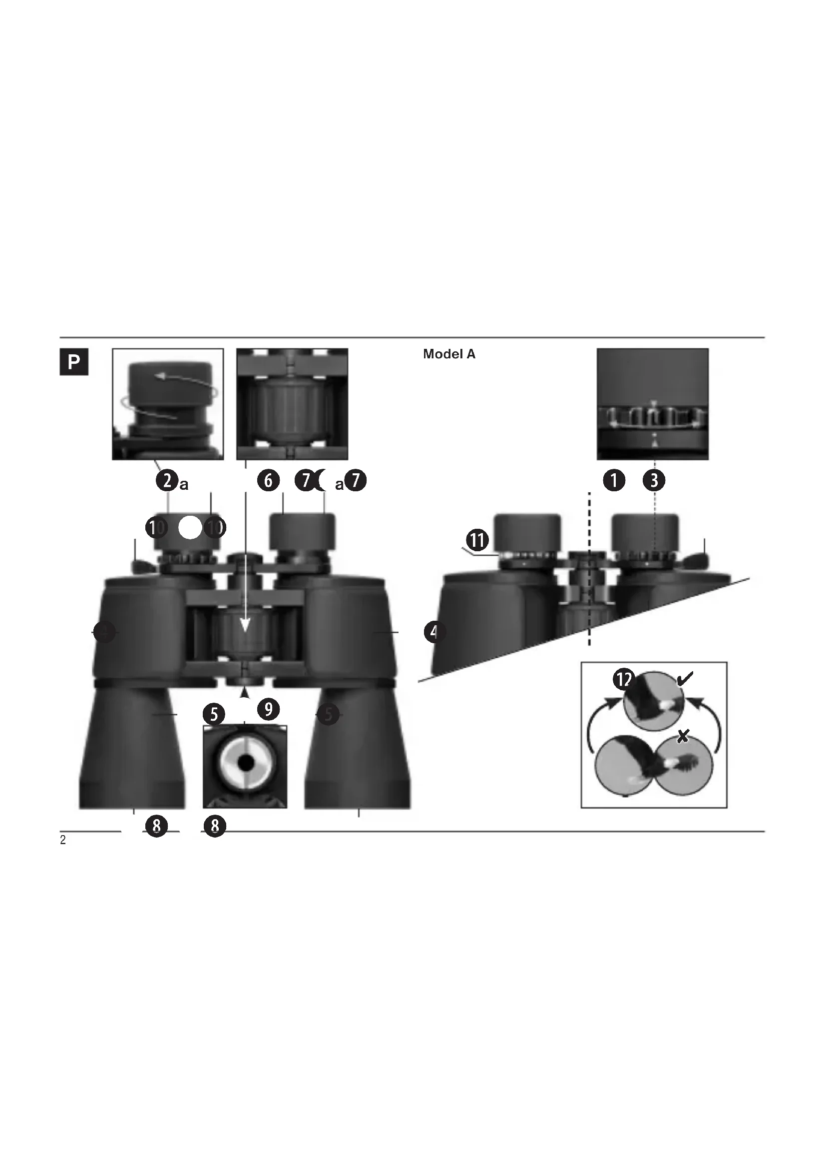 Depending on the model, your binoculars are equipped with either twist-up eyecups (2a) or rubber eyecups (2b). Since there is a larger dis- tance between the binocular eyepiece and the pupil for those wearing glasses, both eyecup varieties can be adjusted individually. Twist-up Eyecups (2a) Screw in the twist-up eyecups (2a) to use the binoculars while wearing glasses. If you are not wearing glasses, unscrew the eyecups to achieve the required distance from the pupils.