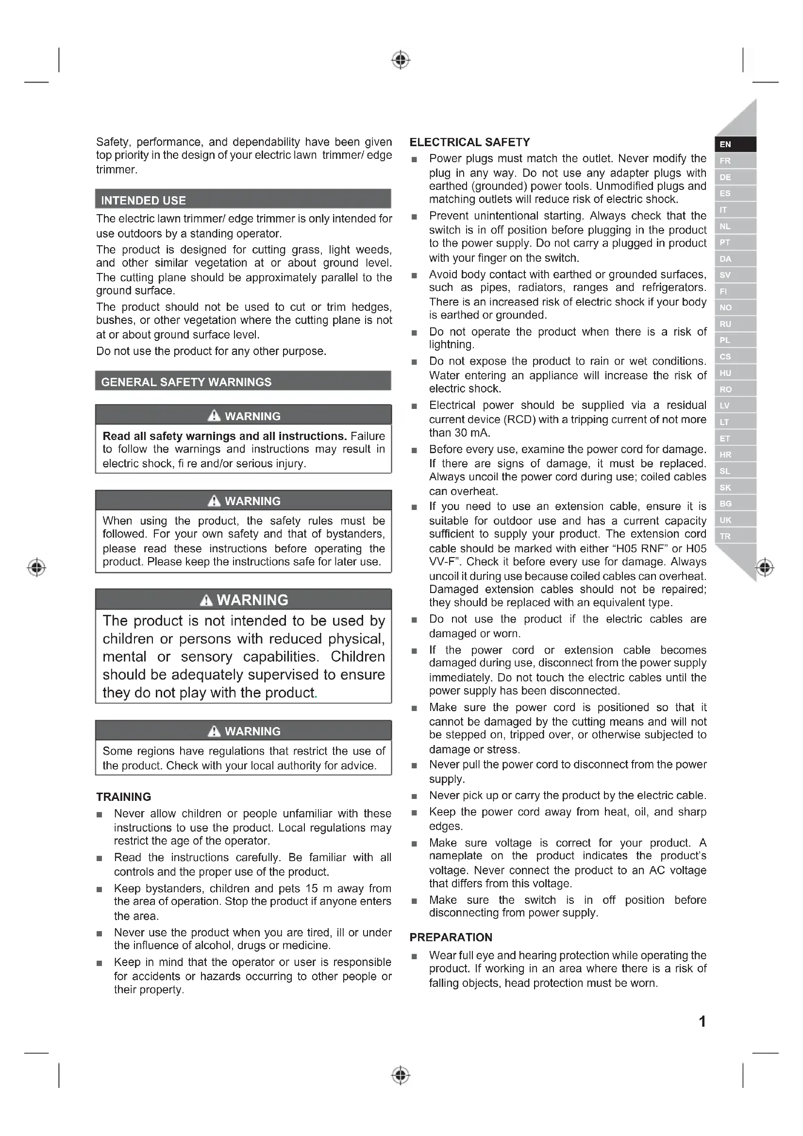 WARNING Read all safety warnings and all instructions. Failure to follow the warnings and instructions may result in electric shock, fi re and/or serious injury. WARNING When using the product, the safety rules must be followed. For your own safety and that of bystanders, please read these instructions before operating the product. Please keep the instructions safe for later use. WARNING The product is not intended to be used by children or persons with reduced physical, mental or sensory capabilities. Children should be adequately supervised to ensure they do not play with the product. WARNING Some regions have regulations that restrict the use of the product. Check with your local authority for advice. TRAINING ■ Never allow children or people unfamiliar with these instructions to use the product. Local regulations may restrict the age of the operator. ■ Read the instructions carefully. Be familiar with all controls and the proper use of the product. ■ Keep bystanders, children and pets 15 m away from the area of operation. Stop the product if anyone enters the area. ■ Never use the product when you are tired, ill or under the influence of alcohol, drugs or medicine. ■ Keep in mind that the operator or user is responsible for accidents or hazards occurring to other people or their property. ELECTRICAL SAFETY ■ Power plugs must match the outlet. Never modify the plug in any way. Do not use any adapter plugs with earthed (grounded) power tools. Unmodified plugs and matching outlets will reduce risk of electric shock. ■ Prevent unintentional starting. Always check that the switch is in off position before plugging in the product to the power supply. Do not carry a plugged in product with your finger on the switch. ■ Avoid body contact with earthed or grounded surfaces, such as pipes, radiators, ranges and refrigerators. There is an increased risk of electric shock if your body is earthed or grounded. ■ Do not operate the product when there is a risk of lightning. ■ Do not expose the product to rain or wet conditions. Water entering an appliance will increase the risk of electric shock. ■ Electrical power should be supplied via a residual current device (RCD) with a tripping current of not more than 30 mA. ■ Before every use, examine the power cord for damage. If there are signs of damage, it must be replaced. Always uncoil the power cord during use; coiled cables can overheat. ■ If you need to use an extension cable, ensure it is suitable for outdoor use and has a current capacity sufficient to supply your product. The extension cord cable should be marked with either “H05 RNF” or H05 VV-F”. Check it before every use for damage. Always uncoil it during use because coiled cables can overheat. Damaged extension cables should not be repaired; they should be replaced with an equivalent type. ■ Do not use the product if the electric cables are damaged or worn. ■ If the power cord or extension cable becomes damaged during use, disconnect from the power supply immediately. Do not touch the electric cables until the power supply has been disconnected. ■ Make sure the power cord is positioned so that it cannot be damaged by the cutting means and will not be stepped on, tripped over, or otherwise subjected to damage or stress. ■ Never pull the power cord to disconnect from the power supply. ■ Never pick up or carry the product by the electric cable. ■ Keep the power cord away from heat, oil, and sharp edges. ■ Make sure voltage is correct for your product. A nameplate on the product indicates the product’s voltage. Never connect the product to an AC voltage that differs from this voltage. ■ Make sure the switch is in off position before disconnecting from power supply. PREPARATION ■ Wear full eye and hearing protection while operating the product. If working in an area where there is a risk of falling objects, head protection must be worn.2 | English ■ Hearing protection may restrict the operator’s ability to hear warning sounds. Pay particular attention to potential hazards around and inside the working area. ■ Wear heavy, long trousers, boots, and gloves. Do not wear loose fitting clothing, short trousers, jewellery of any kind, or use with bare feet. ■ Secure long hair so it is above shoulder level to prevent entanglement in moving parts. ■ Before use and after any impact, check that there are no damaged parts. A defective switch or any part that is damaged or worn should be properly repaired or replaced by an authorised service facility. ■ Make sure the cutting attachment is properly installed and securely fastened. ■ Never operate the product unless all guards, deflectors and handles are properly and securely attached. ■ Consider the environment in which you are working. Keep the working area free from wires, sticks, stones and debris, which if struck by the cutter, can become thrown objects.